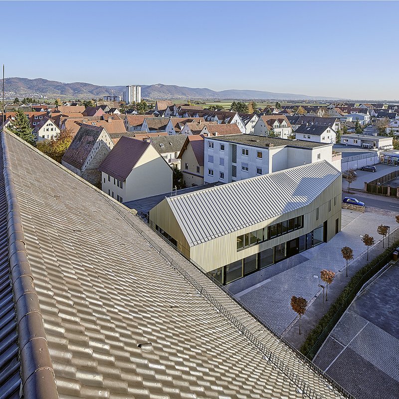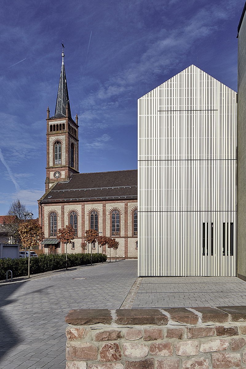 Form und Organisation des neuen Gemeindehauses leiten sich direkt aus den Anforderungen sowie strukturellen Gegebenheiten und Traditionen des Ortes ab. Heddesheim besitzt eine sehr prägende Bebauungsstruktur und Architektursprache aus der Zeit des Tabakanbaus. Auf einem schmalen Grundstück sind neben Gemeindesaal, Gruppenräume und dienenden Funktionen ein großzügiger Außenraum mit attraktiver Durchwegung und Blickbeziehungen zur Kirche entstanden. Als Satteldachbau, ähnlich den benachbarten Scheunen, nimmt das Gemeindehaus die Fluchten von Kirchenschiff und Sakristei auf und steht im rechten Winkel zur Kirche und bildet mit ihr ein klares Ensemble. So definiert es den neuen Weg zwischen Oberndorf- und Beindstraße. Durch eine Abschrägung im Grundriss vermittel das Gemeindehaus zwischen den bestehenden Fluchten, öffnet den Raum in Richtung Ortszentrum und ermöglicht Einblicke in die Tiefe des Grundstücks und zur Kirche. Der leicht ansteigende First arrangiert trotz der Spreizung des Grundirsses eine gerade Traufkante zum östlichen Nachbargrundstück und verleiht dem Baukörper zusätzliche Dynamik und Markanz nach Süden zur Ortsmitte