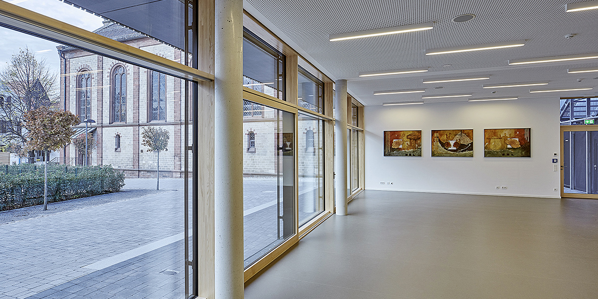 Das Foyer als Dreh- und Angelpunkt liegt mittig im Gebäude, wird durch den Anschnitt jedoch vom Straßenraum sichtbar. Die Loggia bildet nicht nur eine wettergeschützte Vorzone des Sitzungsraums, sondern bietet gleichzeitig einen trockenen Zugang zum Kirchenraum über die bisherige Sakristei, die auf das Niveau von Kirchenschiff und Gemeindehaus abgesenkt wurde. So konnte die bisherige Rampe aufgelöst und ein barrierefreier Zugang zur Kirche geschaffen werden. Brandschutztechnisch ermöglicht erst die in eine Nische des Grundstücks eingefügte Fluchttreppe mit integrierten Außentoiletten die großzügige Bespielung des Foyers mit dreiseitiger Galerie als Herzstück des Gebäudes. Die Gruppenräume im Obergeschoss lassen sich durch Verbindungstüren zu einer Enfilade öffnen und das Gemeindehaus zum Ausstellungsgebäude werden.