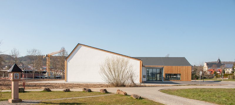 Gut situiert am Ortseingang von Limbach rahmt der Neubau mit der gegenüberliegenden Industrie- und Wohnbebauung städtebaulich klar das Ankommen in den Ort. Limbach verlassend bildet das Haus das Rückgrat des Dorfes und definiert das Ortsende neu. Die L-förmige Kubatur spannt einen Hof zur Straße auf, welcher als Übungsplatz, Stellfläche oder Treffpunkt fungieren und genutzt werden kann.