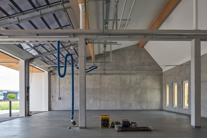 Der senkrecht zur Hauptstraße stehende Gebäudeteil bietet auf zwei Geschossen Platz für die Sozialnutzungen und Einsatzzentrale. Der parallel zur Straße ausgerichtete Teil bietet Raum für 4 Einsatzfahrzeuge, sowie Lagerflächen für Feuerwehrbedarf. Der trichterförmige Haupteingang bildet eine einladende Geste Richtung Ort aus. Lufträume und großzügige Öffnungen schaffen Verbindungen.