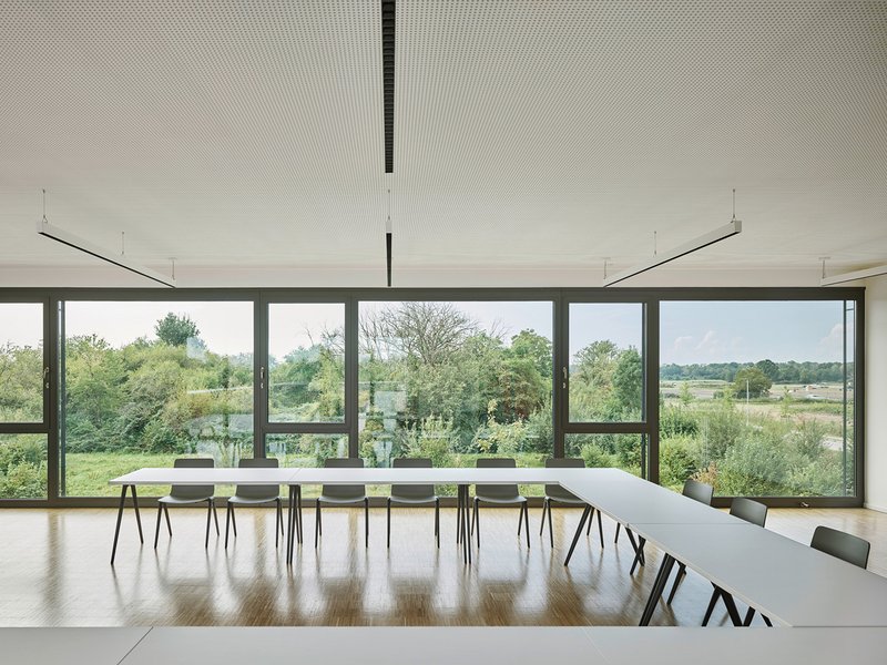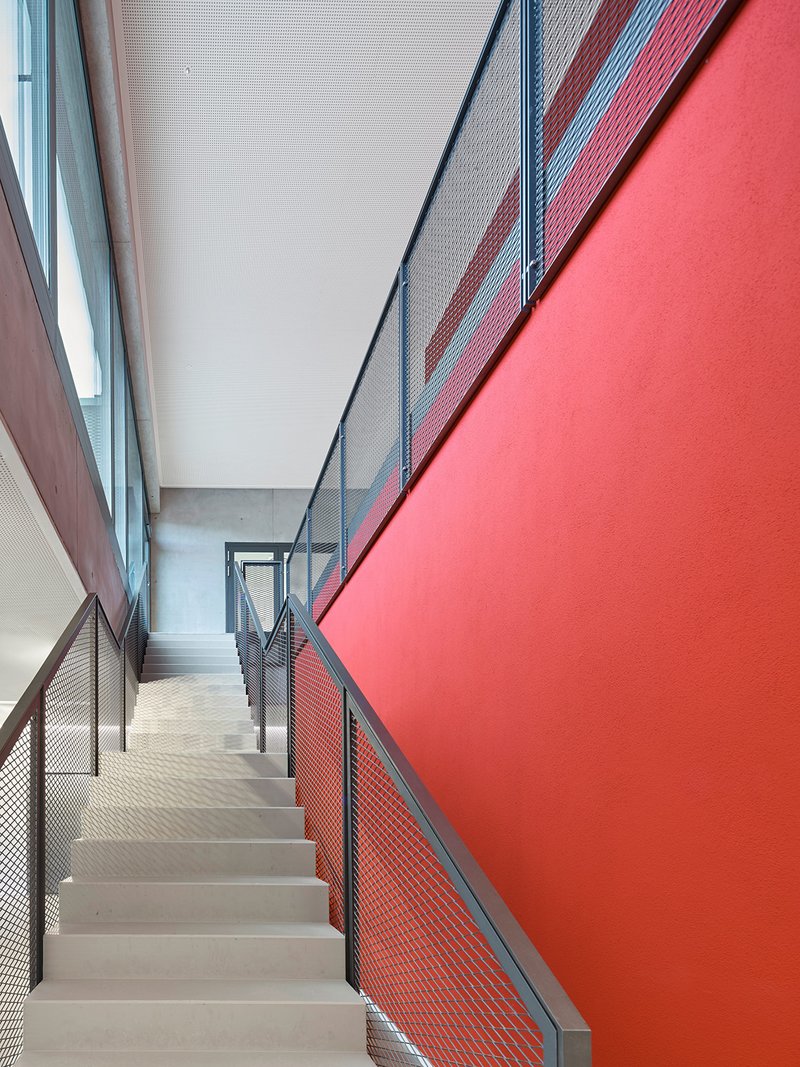 Über den offenen Treppenraum, mit Sichtverbindung zur Fahrzeughalle, erreicht man im Obergeschoss die Verwaltungsräume und den Schulungsraum. Dieser erhält Panoramafenster und eine vorgelagerte Dachterrasse, welche eine ideale Möglichkeit schafft, Schulungspausen in einer angenehmen Umgebung zu verbringen. Von der Terrasse aus bietet sich ein weiter Blick auf den Übungshof, was nicht nur für eine offene Atmosphäre sorgt, sondern auch einen praktischen Überblick überlaufende Aktivitäten ermöglicht.