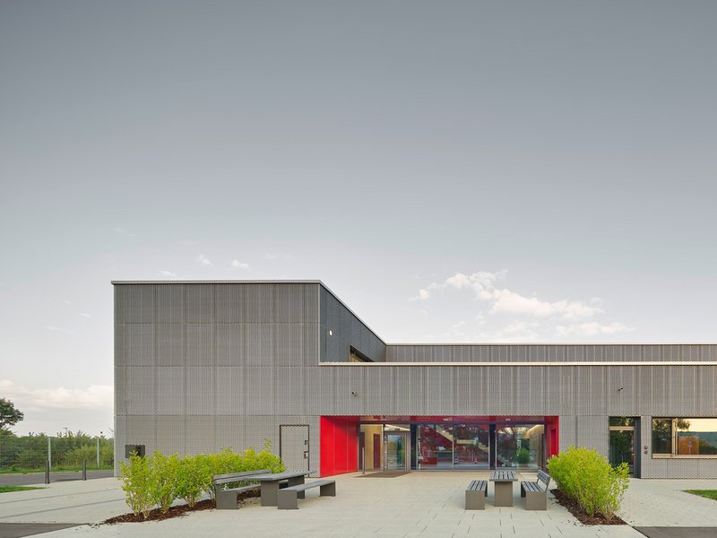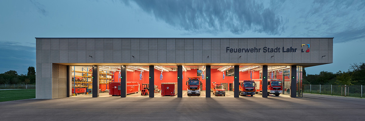 Die Verkleidung aus Aluminium Streckgitter ist als weithin bestimmendes Gestaltungsmerkmal erkennbar. Einschnitte, verdeutlicht durch ein großzügiges Vordach im Westen, sowie der Dachterrasse im Osten prägen den sonst kompakten Baukörper. Durch gezielte Fassadenöffnungen, sowie der farbigen Gestaltung der Innenwände von Fahrzeughalle und Foyer erhält jede Fassade sein individuelles, nutzungsspezifisches Erscheinungsbild. Die öffentlichen Innenbereiche des Gebäudes sind in Sichtbeton ausgeführt, der mit seiner klaren, reduzierten Ästhetik überzeugt und hervorragend zur funktionalen Ausrichtung der Feuerwache passt. Um zusätzliche Technikfläche im Gebäude zu vermeiden sind die erforderlichen Lüftungs- und Entrauchungsanlagen auf dem Dach über der Fahrzeughalle aufgestellt. Die Dachflächen sind extensiv begrünt und mit aufgeständerten PV-Modulen versehen, die insgesamt eine Leistung von 32 kWp erwirtschaften.