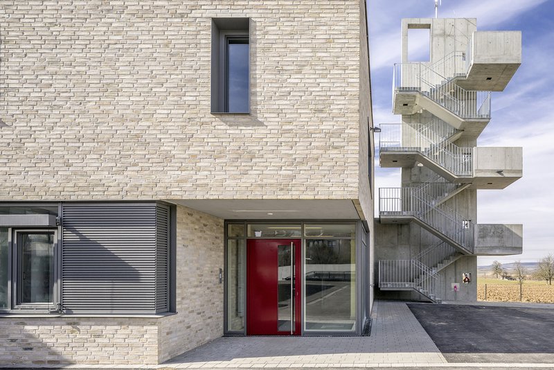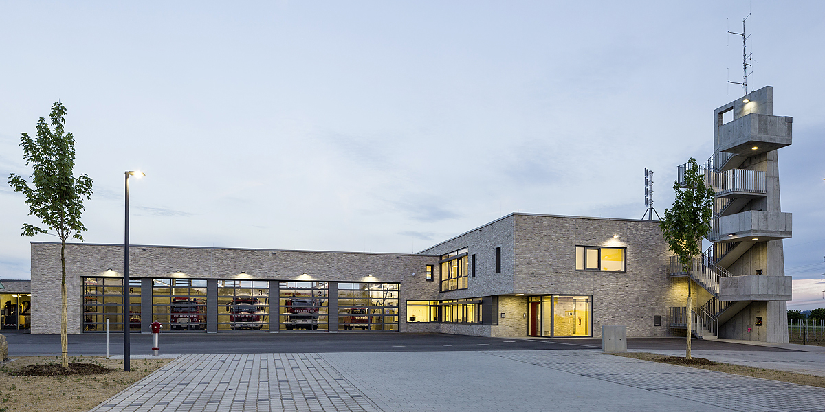 Die neue Feuerwehr liegt als in sich geschlossener kleiner "Campus" jenseits der Horkheimer Straße, am Übergang der Wohnbebauung zu den großen landwirtschaftlich genutzten Flächen im Westen. Feuerwehrhaus und Fahrzeughalle nehmen die Geometrie der Umgebung auf und umfassen in einem Winkel einen geschützten Hofbereich. Im Norden schließen sich die durchgrünten Parkplätze an. Das ganze Ensemble wird zudem von Hecken und einzelnen Bäumen eingefasst und so in die vorhandene Landschaftsstruktur eingebunden.