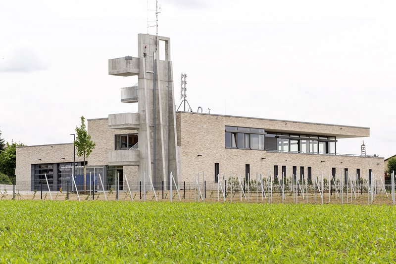 Der Übungsturm markiert den Haupteingang. Dieser ist im Blickbereich der Parkplätze auch für Besucher leicht auffindbar. Von dort sind auf kurzem Weg kreuzungsfrei die Umkleiden, der Funkraum und die Fahrzeughalle erreichbar. Geräteräume, Lager und Werkstätten neben der Fahrzeughalle bieten schnellen Zugriff auf Ausrüstungsgegenstände im speziellen Alarmfall. Grobreinigung und Stiefelwaschanlage liegen auf dem Rückweg zu den Umkleiden.