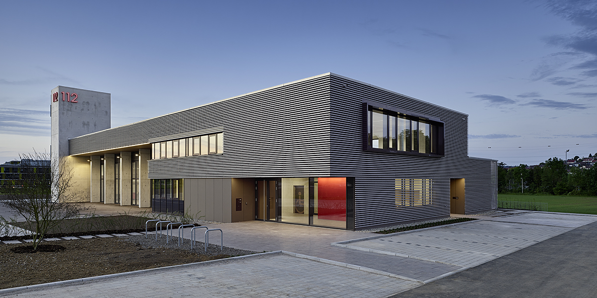 Energie- und ökologische AspekteDer Neubau hat eine möglichst kompakte Bauform mit guter Dämmung. Die große, weitgehend unverkleidete Speichermasse im Innern kann im Zusammenwirken mit gutem Sonnenschutz und einer Nachtauskühlung zum sommerlichen Wärmeschutz herangezogen werden.Für die Wärmeerzeugung wurde eine Luft- Wasser- Wärmepumpe mit einer durchgängigen Fußbodenheizung aller Sozialbereiche und mit Betonkernaktivierung im Bereich der Fahrzeughalle realisiert. Die Duschen, WC- und Umkleideräume im EG erhalten eine Zu- und Abluftanlage mit Wärmerückgewinnung.Die Rinnen am Fahrzeugwaschplatz, die Abläufe in der Fahrzeughalle und die Stiefelwaschanlage werden über einen Koaleszensabscheider mit integriertem Schlammfang abgeleitet.Das Regenwasser der befestigten Außenanlagen wird in einem Versickerungsschacht gesammelt, überschüssiges Regenwasser wird über einen Kanal dem Zipfelbach zugeführt.Das Gebäude erhält eine flächendeckende Brandmeldeanlage mit Weiterleitung zur Leitstelle der Feuerwehr. Zusätzlich gibt es eine Zutrittskontroll- und Einbruchmeldeanlage. In Teilbereichen ist eine Not-Sicherheitsbeleuchtung vorgesehen. Wegen der schwachen Infrastruktur in der Stromversorgung wurde eine Kompakttrafostation mit Anschluss an das Mittelspannungsnetz im Außenbereich hinter dem nordöstlichen Bereich des Feuerwehrhauses erforderlich. Für die gesamte Funktechnik ist auf dem Flachdach ein Funkmast mit Antennen für Digital- und Analogfunk vorgesehen. Ein Anschluss für ein mobiles Notstromaggregat zur teilweisen Versorgung der elektrischen Anlage befindet sich gesichert unter der Fluchttreppe im Außenbereich. Weiter ist sowohl der äußere als auch der innere Blitzschutz berücksichtigt.