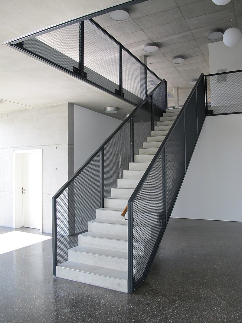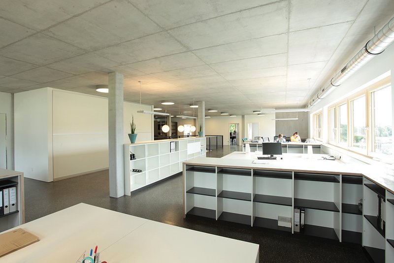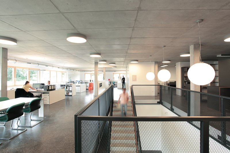 Obwohl die mit einer transluzenten Polycarbonatfassade versehene Lagerhalle teilweise über zwei Ebenen organisiert ist, schafft der Innenraum durch die erstaunliche Tageslichtausleuchtung eine angenehme Arbeitsatmosphäre. Der sich in Materialität und Farbgebung deutlich davon absetzende Verwaltungsbereich ist ebenfalls über zwei Geschosse organisiert und auf beiden Ebenen funktional mit dem Lagerteil verknüpft. Im Inneren empfängt den Besucher ein großzügiger, die Geschosse verbindender Luftraum als zentrales organisatorisches Element und damit gleichzeitig als kommunikativer Mittelpunkt des Hauses. Das robuste und effiziente architektonische Gesamtkonzept geht von der Außenhülle bis zum Schreibtisch. Nicht nur der gesamte Ausbau bis hin zu den einzelnen Arbeitsplätzen wurde individuell entworfen, auch auf jeden einzelnen Sanitärraum wurde im Sinne der Musterausstellung ein eigenes, individuelles Konzept abgestimmt.