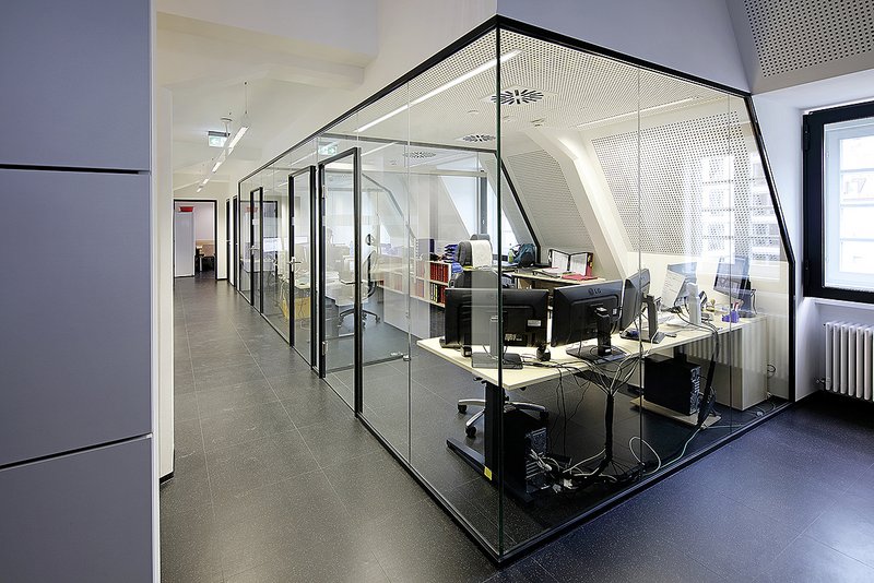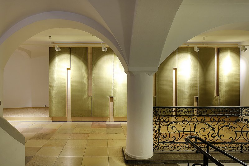 "Haus-im Haus"Aufgrund der Sonderlösungen für Fenster, Gauben und Wände legt sich eine schützende Hülle rund um das FLZ. Darüber hinaus sind sämtliche Anschlüsse und Versorgungskanäle so konzipiert, dass der 520 Quadratmeter große Bereich wie ein eigenständiger Organismus, wie ein "Haus-im Haus", funktioniert. Das neue FLZ kann unabhängig von allen anderen Bereichen betrieben werden: die HLS-Versorgung ist eigenständig, ebenso die Lüftungsanlage und das Rechenzentrum. Es existiert eine eigene Notstromversorgung. Außerdem sind die Räume als gesonderter Brandabschnitt geplant. Zugänglich ist das FLZ lediglich über zwei per Videoüberwachung kontrollierte Schleusen.Dass es trotzdem nicht wie ein Fremdkörper wirkt, liegt an der sorgfältigen Detailierung und Gestaltung der Räume. hochstrasser.architekten haben bewusst den vorhandenen Materialkontext der 1920er-Jahre aufgenommen, ihn aber neu interpretiert. So beziehen sich beispielsweise die Zugangsschleusen mit ihrem goldfarbenen, auf Holzwerkstoff aufgezogenen Messinggewebe auf die Farbigkeit der Solnhofer Fußbodenplatten im Treppenhaus, als auch auf die Materialität der alten Messingelemente, wie Geländer und Beschläge.
