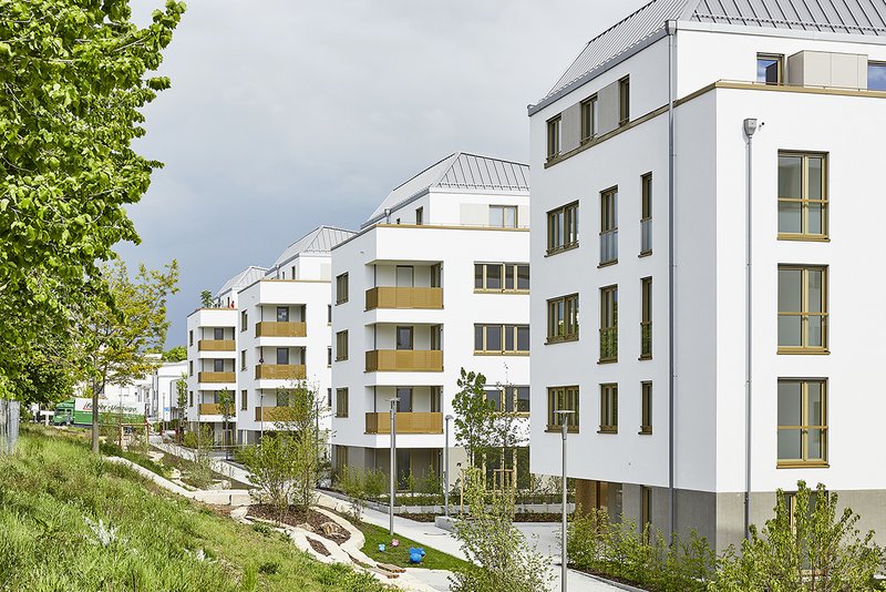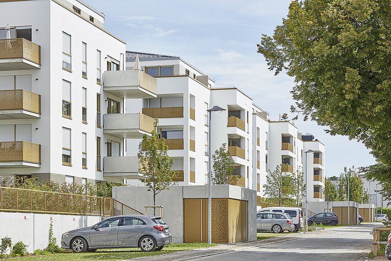 Architektur und GestaltungDie Gebäudeversätze der Mietwohnungsbauten tragen zur Gliederung der Baukörper und Fassaden bei. Die hellen Putz-Flächen werden mit farbig strukturierten Bereichen in Sockel- und Dachgeschosszone unterteilt. Durch eine unterschiedliche Ausformulierung der Balkon- und Eingangselemente (gestanztes Blech bzw. Streckmetall) werden die Gebäude als individuelle Häuser ablesbar. Die pragnante Farbgebung der Fenster und Metallelemente schafft eine Identitatsbildung mit hohem Wiedererkennungswert.Die Eingänge der Gebäude werden durch die vorgelagerten Platzbereiche zu nachbarschaftlichen Treffpunkten aufgewertet, die als Aufenthaltsbereich für alle Altersgruppen zum Verweilen einladen. Ein blühender Hofbaum und Sitzgelegenheiten schaffen eine wohnliche Atmosphäre. Die, an die barrierefreie Durchwegung angrenzenden, Spielbereiche sind von den Plätzen einsehbar und bespielen den nordlichen Geländesprung. Private PKW- und Fahrrad-Stellplätze werden in zwei unabhängig voneinander erschlossenen, erdüberdeckten und begrünten Tiefgaragen untergebracht.