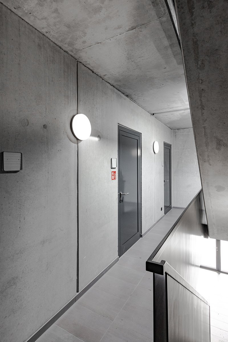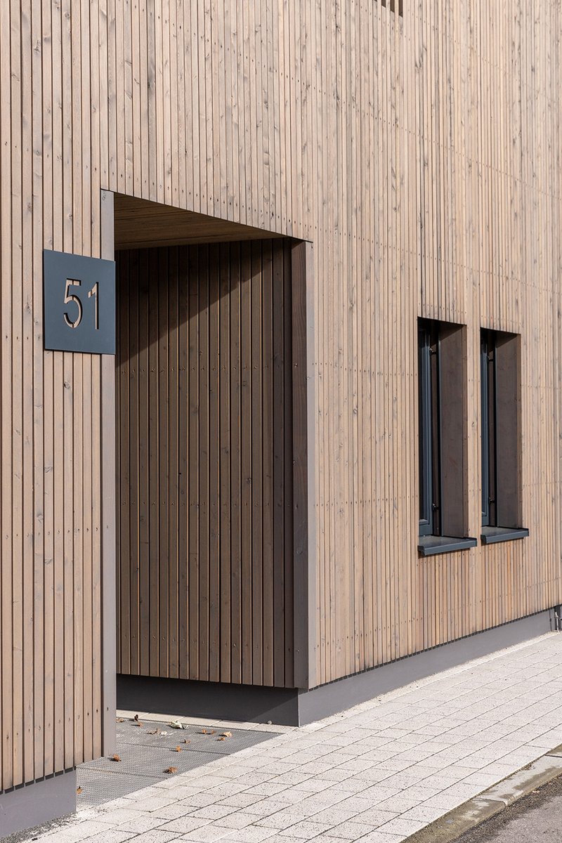 Der Holzbau entwickelt sich um das massive Treppenhaus im Kern des Gebäudes. Der schlichte und natürliche Charakter entfaltet sich durch die spannende Wechselwirkung der komplementären Materialwahl. Die Fassade mit Holzlamellenverkleidung sorgt für eine harmonische Rhythmisierung der Wandöffnungen. Ein Bauwerk in Holzbauweise spiegelt die lokale Tradition und Handwerkskunst wider. Der Baustoff Holz wird oft mit Natürlichkeit, Wärme und Behaglichkeit assoziiert, was positiv zur Wahrnehmung des Gebäudes beiträgt. Sichtbeton steht für Robustheit und Beständigkeit, während er gleichzeitig eine moderne, industrielle Ästhetik verkörpert. Diese Kombination aus den natürlichen Materialien Holz und Beton schafft eine harmonische Balance zwischen Natürlichkeit und Modernität.