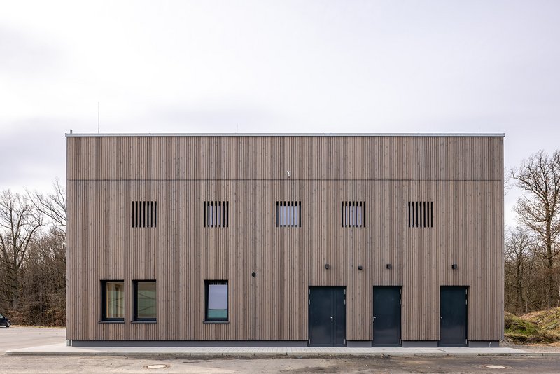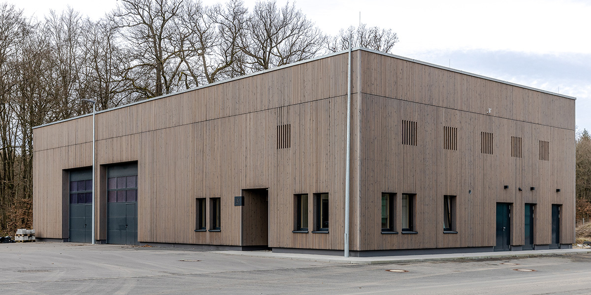 Das Gebäude ist ein Beispielobjekt, das sich im Sonderbau mit Holzbauweise auseinandersetzt. Es ist eine ebenso ästhetische, wie funktionale und ökologisch nachhaltige Bauweise, die sich harmonisch in die waldnahe Umgebung einbettet. Die Konstruktion besteht aus Holzständerwänden mit Brettstapeldecken und einem massiven Kern aus Sichtbetonwänden und Betondecken im Treppenhaus. Holz als wesentlicher Baustoff gibt Antwort auf einen zeitgemäßen Umgang mit Klimaschutz und Ressourcenschonung. Herausragend in Energieeffizienz, Nachhaltigkeit und Flexibilität. Auch im Innenraum schafft Holz eine angenehme Atmosphäre und ein natürliches, gesundes Raumklima.
