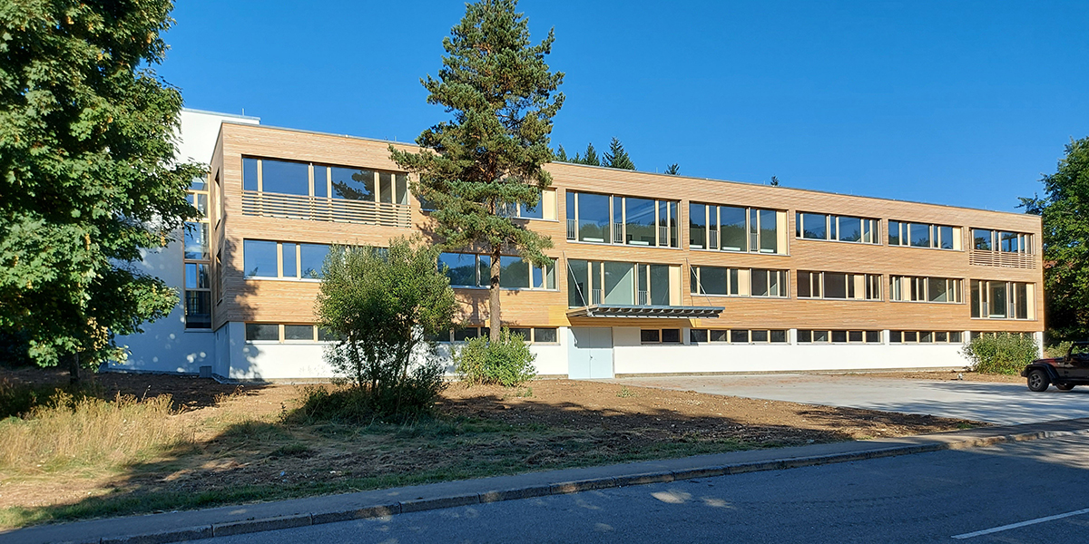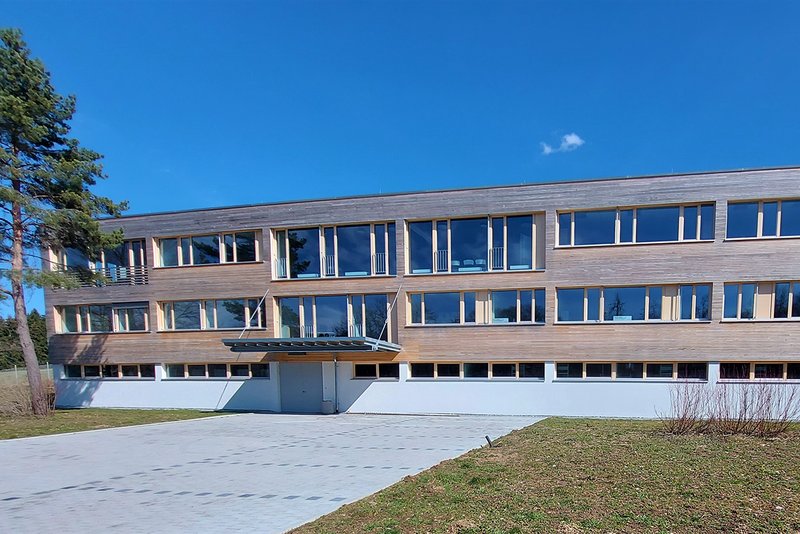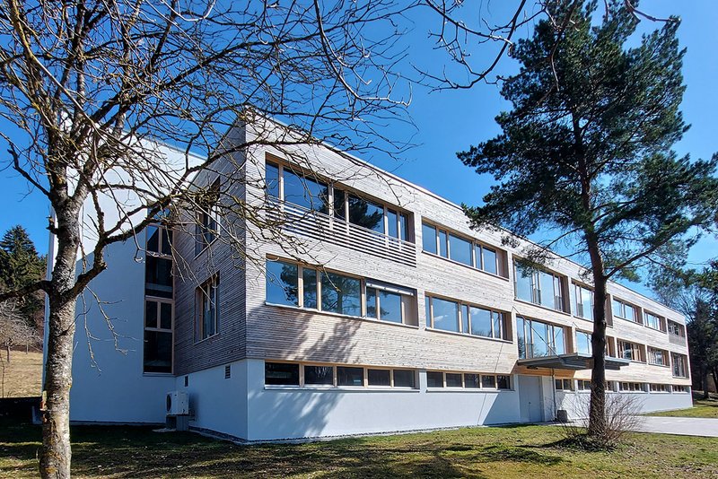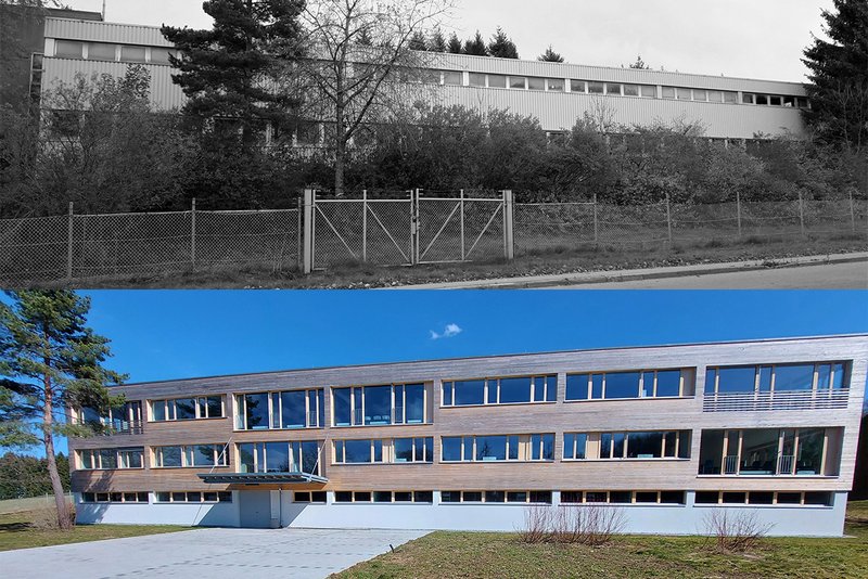 GeschichteDas „Gebäude 48“ befindet sich am Rande der ehemaligen Kaserne in Meßstetten. Seit der Auflösung dieses Bundeswehrstandortes bemühten sich die Stadt Meßstetten und der Landkreis Zollernalb um eine Nachnutzung des gesamten Areals. Immerhin ermöglichte die über die Jahre aufrecht erhaltene Infrastruktur eine Zwischennutzung zur Aufnahme von Flüchtenden. In den kommenden Jahren wird sich das ehemalige Kasernengelände zu einem interkommunales Industrie- und Gewerbegebiet entwickeln. Um diesem Prozess Schwung und Glaubwürdigkeit zu verleihen, entschied sich der Landkreis dazu, das hier vorgestellte „Leuchtturmprojekt“ zu verwirklichen.Das „Gebäude 48“ wurde 1973 gebaut und diente der Standortverwaltung (StoV) als Werkstatt- und Lagergebäude. Teile des Untergeschosses wurden als Bunker ausgebildet. Im Obergeschoss befand sich seit jeher die Kleiderausgabe für Soldaten der Bundeswehr. Größe, Zustand und Konstruktion des Gebäudes wie auch seine Positionierung im Zugangsbereich des Areals sprachen für die Projektidee des Landkreises, hier eigene Verwaltungsflächen entstehen zu lassen.