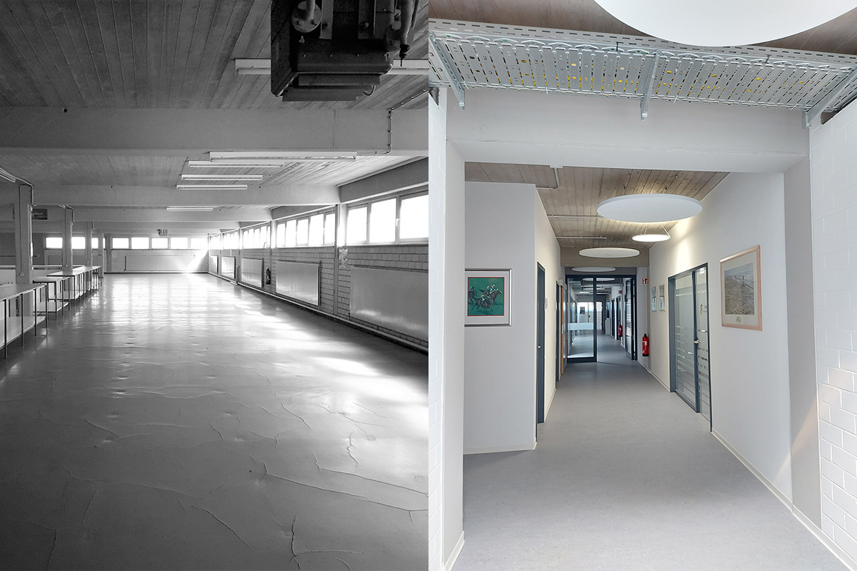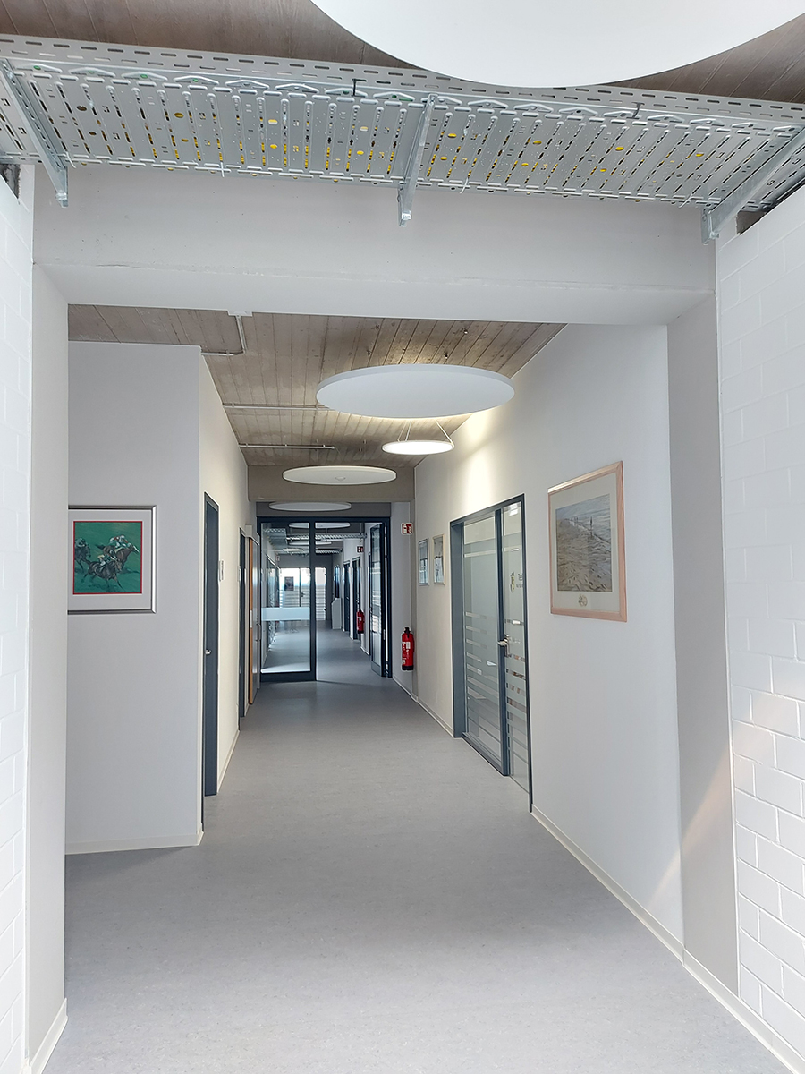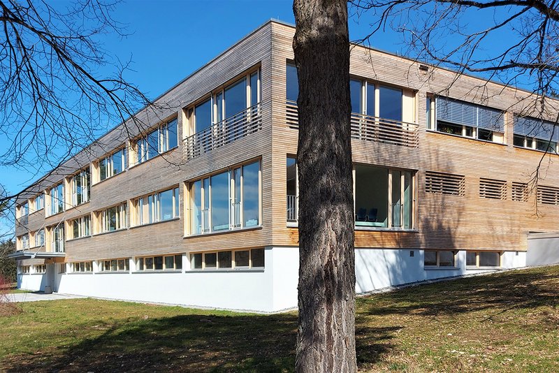 Bauaufgabe und UmsetzungDie Schwierigkeit bestand nun darin, einen flexiblen, adaptiven Grundriss zu entwerfen, der auf mögliche Nutzerwechsel reagieren können muss. Dasselbe galt für eine Fassadengestaltung, die jederzeit alle Möglichkeiten offenlässt, die dahinterliegende Fläche sowohl in großzügige Bereiche als auch in kleinteilige Einzelbüros aufzuteilen. Außerdem sollte auf wirtschaftliche Art und Weise ein nachhaltiger Umbau realisiert werden, der architektonisch interessant ist und ein zeitgemäßes Arbeitsumfeld im Stand der Technik schafft.Zu diesen komplexen Vorgaben gesellte sich dann der eigene Anspruch, den Charakter des Gebäudes zu erhalten und weiter herauszuarbeiten, hauptsächlich bestimmt durch seine Stahlbeton-Skelettbauweise. So konnten im Bereich der Außenwände nichttragende Fensterbrüstungen durch großzügige Fensterelemente ersetzt werden. Innenwände, Verglasungen und abgehängte Decken wurden so angeordnet, dass Stützen- und Trägerstrukturen ablesbar blieben. Holzpflasterbeläge der ehemaligen Werkstattbereiche wurden größtenteils erhalten und überarbeitet. Bestehende Stahlgeländer wurden durch Streckmetallbrüstungen und Holzhandläufe ergänzt und aufgewertet. Die mit Brettern geschalten Decken und sichtgemauerten Wände wurden in Flur- und Nebenraumbereichen belassen und verleihen dem Innenraum in Verbindung mit sichtbar geführten Elektropritschen und Lüftungsrohren einen industriellen Stil, kombiniert mit Akustiksegeln und modernster LED-Beleuchtung.Die unbehandelte Holzfassade aus kreiseigener Weißtanne ersetzt nun die ursprüngliche Trapezblechfassade und stiftet Identität, gemeinsam mit Holzfensterelementen und den gezielt über das Gebäude verteilten Fensterpaneelen. Die charakteristische Laderampe wurde saniert und durch ein verzinktes Geländer mit Stahlnetzfüllung ergänzt. Gebäudezugangsbereiche konnten um passend gestaltete Vordächer und einen barrierefreien Zugang aufgewertet werden.