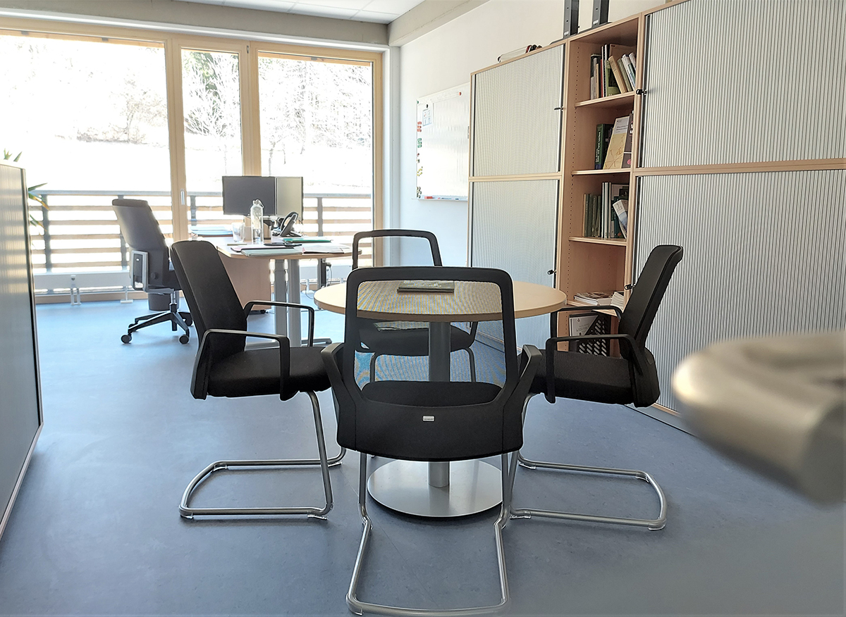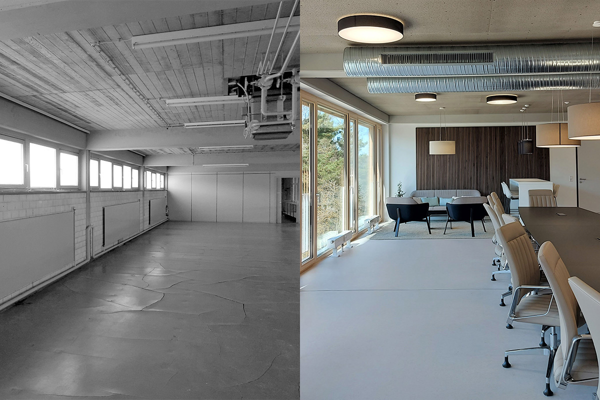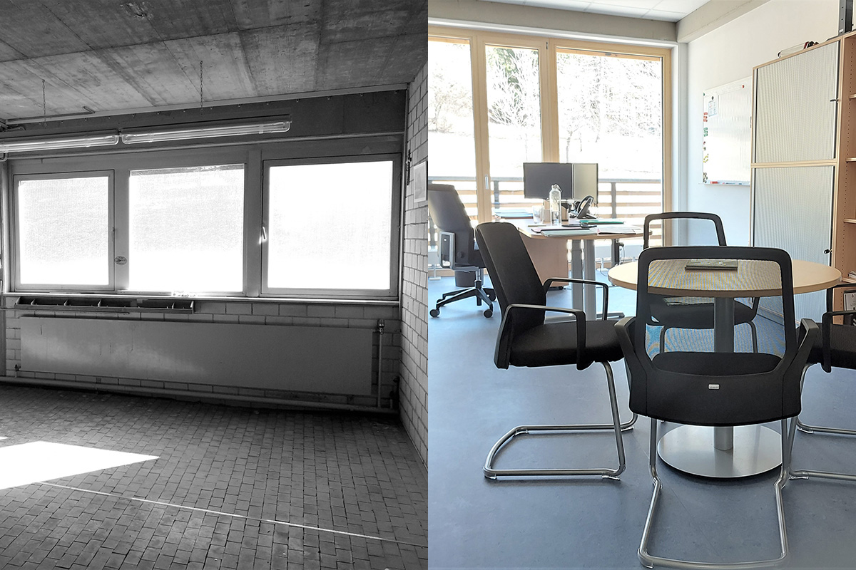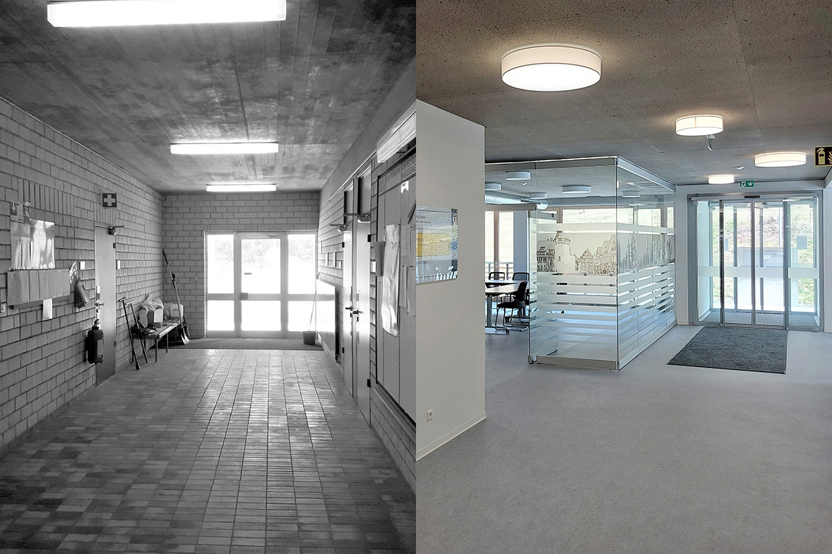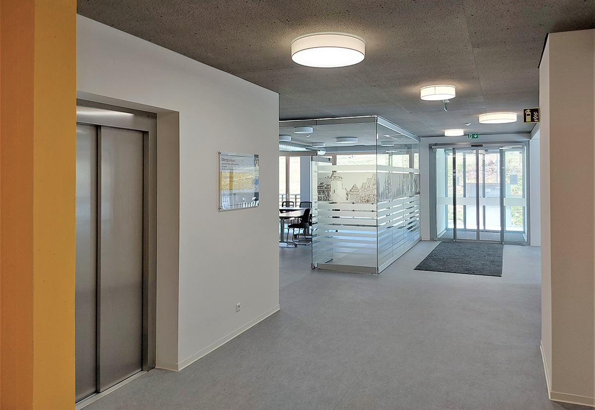 Gebäudenutzung und ErgebnisDurch den Einbau eines Personenaufzugs können alle entstandenen Büro-, Besprechungs- und Sozialbereiche in Erd- und Obergeschoss barrierefrei erreicht werden, wie auch die Nebenraum- und Archivbereiche im Untergeschoss. Auf dem sanierten Flachdach wurde eine kleine Pausenterrasse errichtet, die von den Gebäudenutzern selbst gestaltet werden kann. Genutzt wird das Gebäude zum Zeitpunkt der Fertigstellung von den kreiseigenen Abteilungen Forstamt, Straßenbauamt und Archiv. Die Landesregierung mit „Forst BW“ und der „Zweckverband Interkommunaler Industrie- und Gewerbepark Zollernalb“ konnten zusätzlich als Mieter gewonnen werden. Für die verfügbare Restfläche mit rund 350 m² konnte ein weiterer Mieter gewonnen werden, sodass auch diese Fläche künftig genutzt wird.