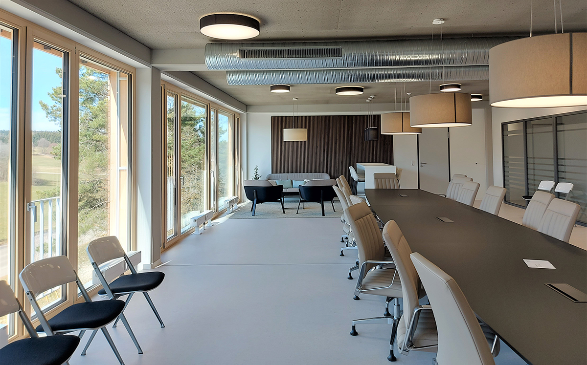 HaustechnikDas Haus ist an ein Nahwärmenetz auf Biogasbasis angeschlossen. Auf diese Weise werden die Raumwärme und das Brauchwasser für die Mitarbeiterduschen erzeugt. Die Besprechungs- und Sanitärräume werden mechanisch be- und entlüftet; alle Büroräume können manuell über ausreichend viele Fensterflügel individuell mit Frischluft versorgt werden. Der sommerliche Wärmeschutz wird über außenliegende Jalousien hergestellt. Eine auf die Nutzer abgestimmte Lichtsteuerung sorgt in Verbindung mit modernster LED-Technik für einen stromsparenden Betrieb des Gebäudes. Der Archivbereich ist in zwei Klimazonen unterteilt und wird unter Einbindung einer Wärmepumpe passend zum verwahrten Archivgut – Kunstwerke und Zeitungskopien aus dem Zollernalbkreis – präzise klimatisiert.