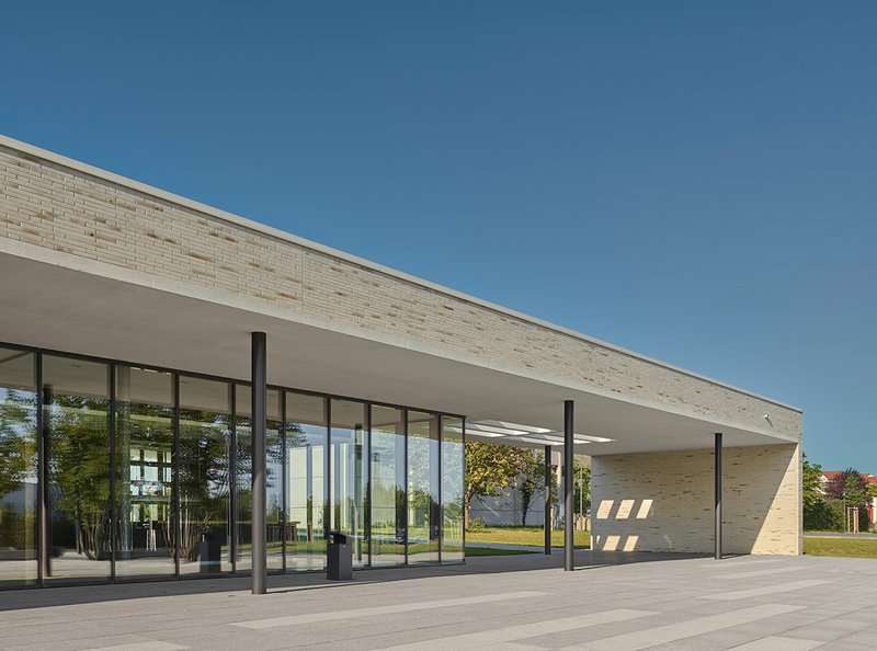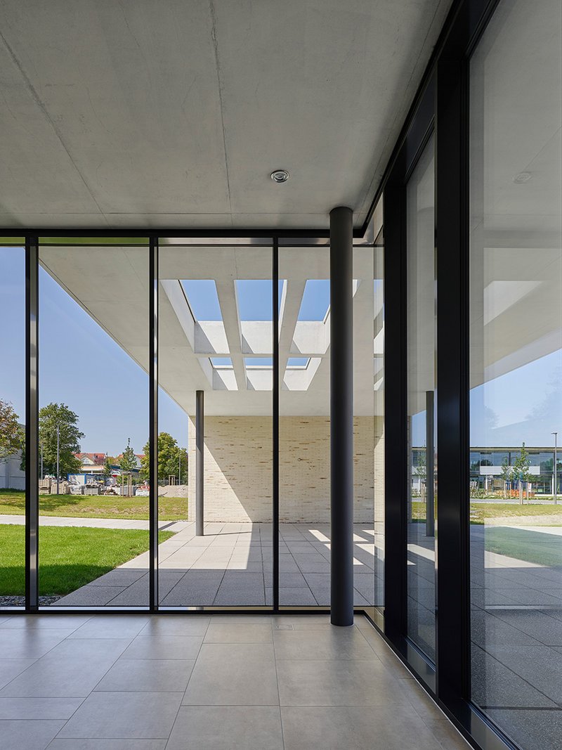 Landschaftliche Einbindung und FreiraumEinen weiträumigen Vorplatz mit schattenspendenden Bäumen, eine großzügige öffentliche Freispielfläche mit topographisch eingebundenen und bewachsenen Sitzstufen, sowie ein sorgsam gestaltetes Regenrückhaltebecken – für die immer häufiger auftretenden Starkregen – hat die Landschaftsplanung für das Freiraumkonzept umgesetzt.