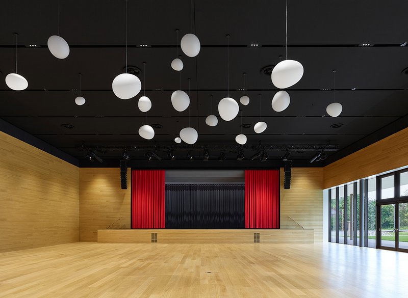 Konzeption der InnenräumeDreh- und Angelpunkt ist der große Saal. Bei Bedarf lösen wandeingelassene Schiebeelemente die Trennung zwischen Foyer und Saal auf, nicht nur funktional entsteht ein durchgängiger Raum. So unterschiedlich die Räume einzeln sind, das weiße Foyer mit warmtönigem Steinboden und der holzgefasste Saal mit schwarzem Himmel ergänzen sich. Der Ausblick in den Freiraum und die wenigen roten Akzente verbinden beide zu einem ganzheitlichen Raumeindruck, der zusammen mit den Außenräumen auch als eine Nutzungseinheit bespielt werden kann. Die Nebenräume sind gut erreichbar, jedoch greifen sie in den Ereignisraum nicht störend ein.