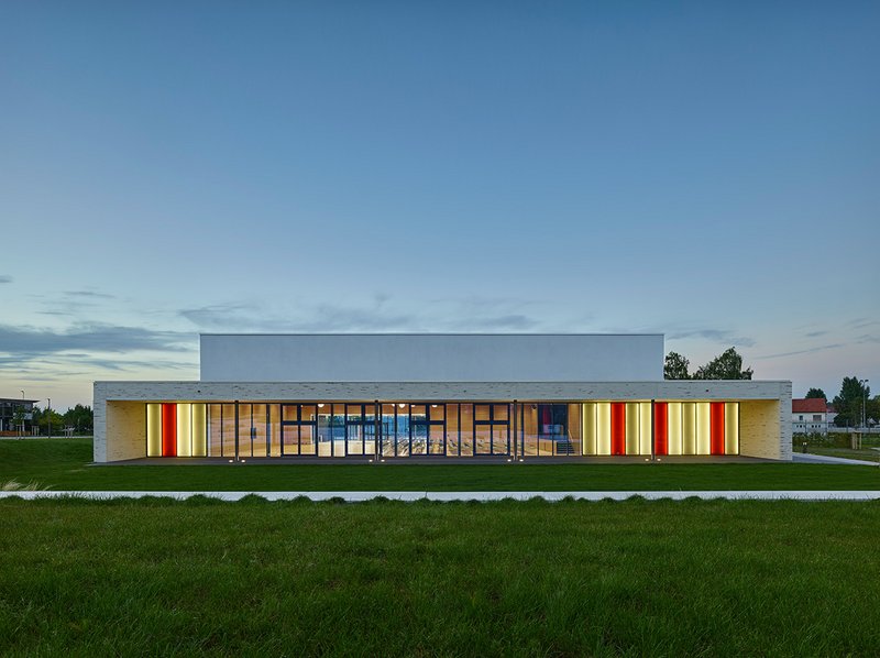 Konzeption und städtebauliche EinbindungDas Gebäude der Gemeindehalle wirkt wie der Schlussstein des großen Schulcampus, über seinen Vorplatz leistet es die Anbindung des angrenzenden Gewerbegebiets und verbindet über das neue Fußwegenetz auch, durch hybride dörfliche Strukturen hindurch, mit dem Ortszentrum. Die ruhige, hochwertige Gestalt des Gebäudes gibt dem diffusen Quartier räumlichen Halt, verleiht ihm ein Gesicht und eröffnet mit seiner torartigen, aber unprätentiösen Geste neue kurze Wege. Die großzügigen Freiflächen von Vorplatz, Freiraumtribüne und Retentionsflächen stellen das Gebäude gegenüber der Nachbarschaft genügend frei, um es als öffentliches Haus städtischer Angebote und Kultur wahrnehmbar zu machen.