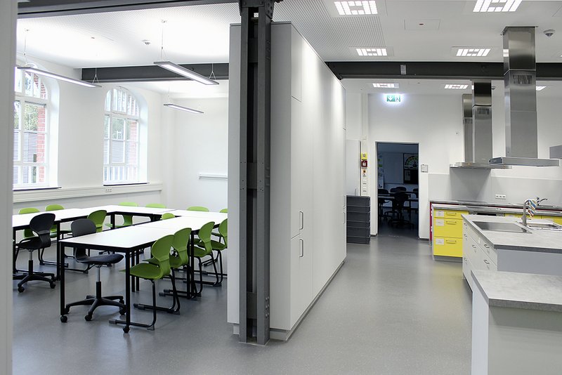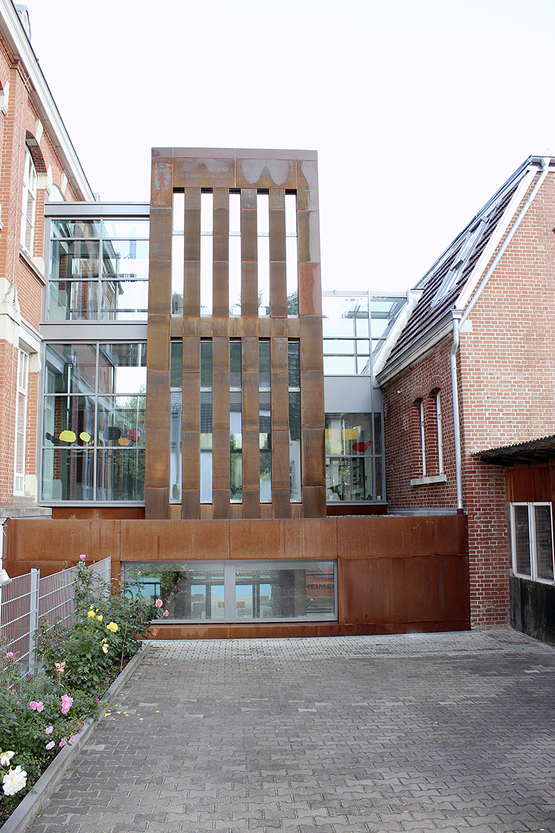 Der Zwischenbau wurde als Turm so konzipiert, dass im Hofgeschoss ein neuer Eingang mit Eingangshalle ausgebildet wird. Mit dem Zwischenbau werden die unterschiedlichen Höhen und Ansatzpunkte für die notwendigen Verbindungen der beiden Gebäude ausgeglichen. Gestalterisch ist der Zwischenbau so konzipiert, dass ein markantes vertikales Element entsteht. An dieses Element gliedern sich an den unterschiedlichen Stellen die Übergänge als verglaste Verbindungen an. Somit bleiben in Abstimmung mit dem Denkmalschutz die beiden Gebäude in der bestehenden Kubatur erlebbar, und die Fassaden werden möglichst wenig „gestört“. Mit dem Material Corten-Stahl wurde versucht, eine Verbindung in Farbe und Haptik zu den Ziegelfassaden herzustellen. Die Fassade des Verbindungsbaus ist zur Bundesstraße geschlossener und zum Park hin offener konzipiert.