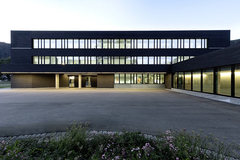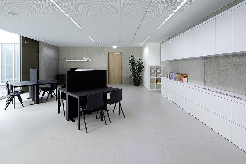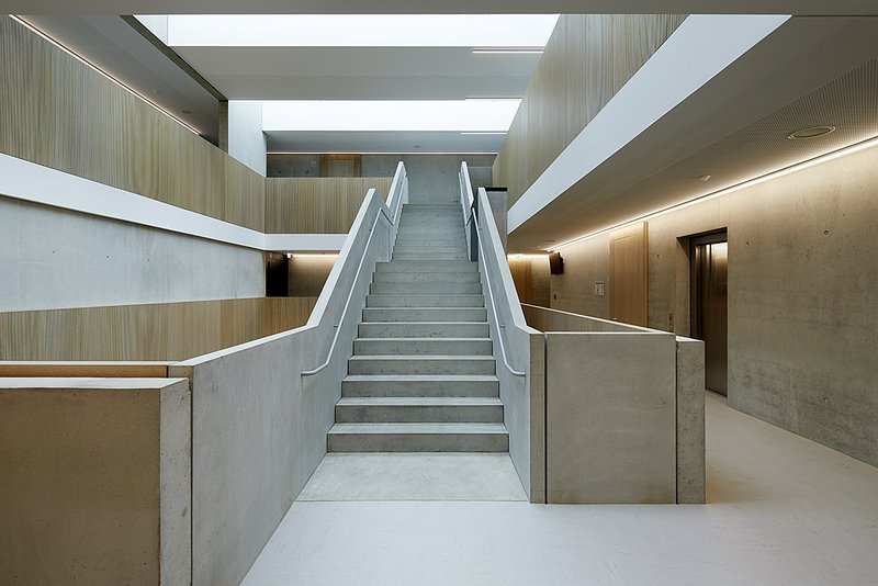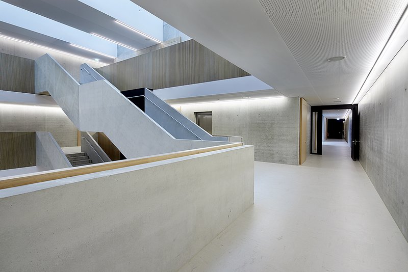 Städtebau Die städtebauliche Situation im Bereich des Schulneubaus wird durch die umgebende Parklandschaft mit einzelnen eingestreuten Solitärbaukörpern geprägt. Der kubische Baukörper der Neuen Gemeinschaftsschule ist als weiterer "Baustein" in dieses großzügige grüne Areal positioniert und orientiert sich im Norden parallel zur bestehenden Sporthalle. Ein verbindender eingeschossiger Gebäudeteil bindet im Osten an den ebenfalls eingeschossigen Fachklassentrakt des Gymnasiums an. Die südliche Platzseite des eingefassten Pausenhofbereiches bildet das bestehende Joachim-Hahn-Gymnasium, nach Westen schließt frei die offene Parklandschaft an. Von hier führen baumumstellte Fußwege von der Bushaltestelle und der Eduard-von-Langstraße zur Schule. Der Haupteingang der neuen Gemeinschaftsschule erfolgt von Süden, markiert durch ein markantes in die Baukörperfigur integriertes Vordach über den zurückhaltend neu gestalteten Pausenhof. So entsteht mit dem alten und dem neuen Schulgebäude ein einladendes Ensemble mit einen attraktivem, gefasstem Pausenbereich, der die angrenzende Parklandschaft gestalterisch integriert. Architektur und Funktionen Der dreigeschossige Rechteckbaukörper derneuen Gemeinschaftsschule ist klar und übersichtlich strukturiert. Im Erdgeschoss befinden sich neben der dreigeschossig erlebbaren, lichtdurchfluteten Pausenhalle alle musischen, technischen und naturwissenschaftlichen Fachlassen. Direkt am Windfang des Haupteinganges angeschlossen ist der Zugang für den Musikverein. Somit ist ein unabhängiger Betrieb des Musikvereins/Jugendmusikschule nach Schulschluss gewährleistet. Für größere Schulveranstaltungen bzw. für den Ganztagsbetrieb kann der Musikraum flexibel über eine mobile Trennwand der Pausenhalle zugeschaltet werden. Der innere Gebäudekern beherbergt die untergeordneten Funktionen der Sanitär- und Lagerräume sowie die Technikzentrale. Eine freie Sichtbetontreppe in der lichten, dreigeschossigen Pausenhalle verbindet alle Geschosse räumlich und visuell miteinander. Zwei zusätzliche Treppenhäuser in den Ecken sichern die erforderlichen Fluchtwege und ermöglichen schnelle Raumwechsel über die Geschosse hinweg. Im 1. Obergeschoss ist nach Westen und Norden der Lehrer- und Verwaltungsbereich mit verschiedenen zugeordneten Besprechungsbereichen zentral und gut erreichbar am Luftraum der Pausenhalle angeordnet. Um einen weiteren eingeschnittenen zweigeschossigen Lichthof lagert sich im 1. Obergeschoss das großräumige gemeinsame Lernbüro an. Des Weiteren befindet sich auf dieser Ebene neben dem Computerraum und dem Sozialarbeiterraum auch ein ruhiger Rückzugsraum für die Schüler.Im 2. Obergeschoss befinden sich alle weiteren Klassenräume auf einer gemeinsamen Ebene sowie ein Multifunktionsraum, der synergetisch sowohl für Handarbeit und Kunst als auch für Arbeiten am Computer genutzt werden kann. Zusammenfassend sind in enger Abstimmung und intensivem Dialog mit dem Nutzer alle Raumbereiche optimiert und multifunktional gemeinsam mit der Stadt Blaubeuren und allen Planungsbeteiligten im Sinne eines lebendigen und vielfältigen Schulorganismus entwickelt worden.