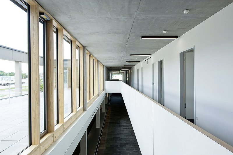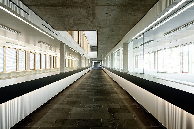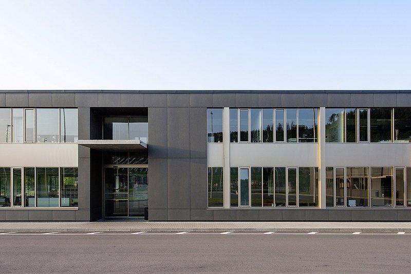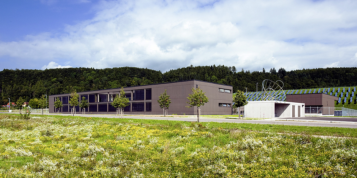 Energetische und ökologische AspekteBei der Planung und Umsetzung des Gebäude- und Energiekonzeptes wurde besonderer Wert auf die Erfüllung der Aspekte des „Nachhaltigen Bauens“ gelegt. Ziele des Klimaschutzes, insbesondere die Reduzierung des CO²-Ausstoßes, sind umfassend in die Planung eingeflossen. So konnten die Transmissionswärmeverluste auf 40 % unter Energieeinsparverordnung gesenkt werden. Eine mit Ökostrom betriebene Grundwasserwärmepumpe ermöglicht energieeffiziente Kühlung im Sommer und wirtschaftliches Heizen im Winter. Die massive Konstruktion der Gebäude wird als Speichermasse genutzt, um äußeren Temperaturschwankungen entgegenzuwirken. Das Niederschlagswasser der Dachflächen, der PKW-Stellplätze sowie der auf dem Baugrundstück vorhandenen Grünflächen wird mittels dezentral angeordneter Versickerungsmulden über die belebte Bodenschicht versickert.