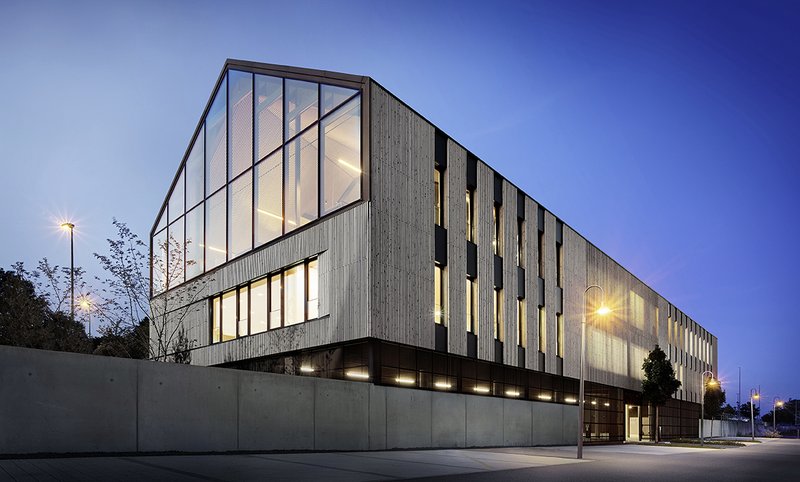 Konstruktion, Technik, Details, AusführungDas Gebäude wurde als schlanke Stahlbetonskelettkonstruktion erstellt, um dauerhaft die Flexibilität der Grundrisse zu gewährleisten. Die Fassaden wurden aus vorgefertigten Holzständerwänden und die Dachkonstruktion aus Holzbindern gefertigt. Die Fassadenverkleidung besteht aus schlanken Lamellen aus heimischer Douglasie. Das Gebäude ist als ausgesprochenes Lowtech- Gebäude konzipiert. Beheizt mit einem Holzpellets-Kessel nutzt es im Winter die solaren Gewinne. Es wird über die Fenster belüftet, lediglich die großen Räume im Obergeschoss verfügen über dezentrale Lüftungselemente mit Wärmetauscher.