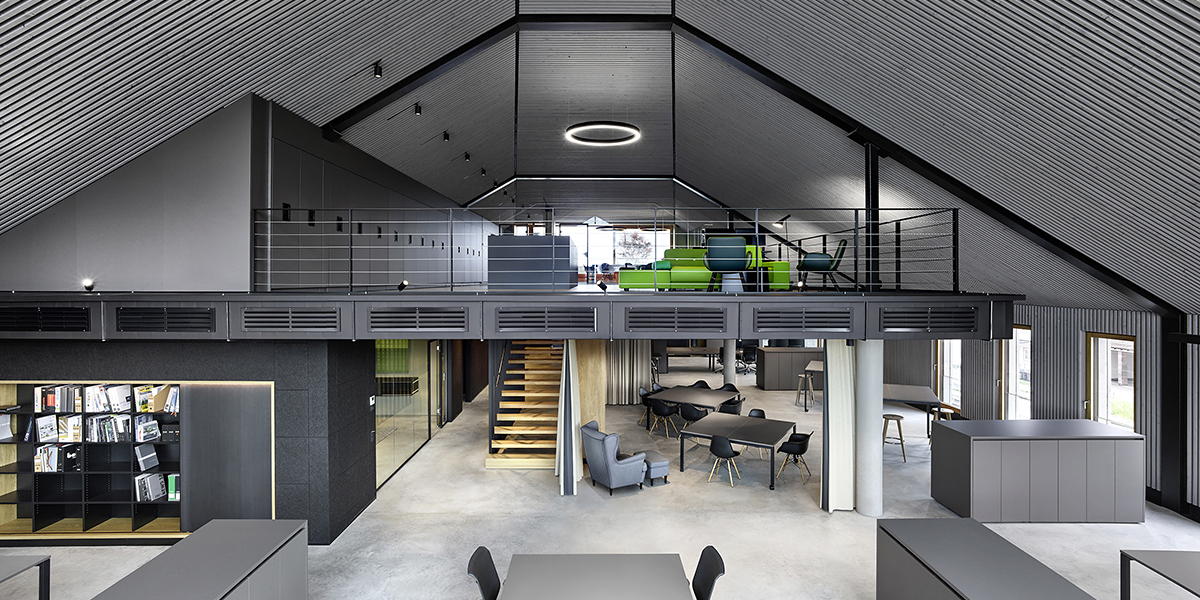 Äußere Gestalt und InnenraumgestaltungDas Erscheinungsbild des Gebäudes soll auf den ersten Blick seine gewerbliche Nutzung widerspiegeln. Das Büro ist von außen erkennbar, Trainingsraum und Empfangsräume der Nutzungseinheiten erhalten große Verglasungen. Der direkte Blick wird durch die Lamellenfassade gefiltert.Eine Besonderheit in der Innenraumgestaltung ist aber zweifelsohne das Architekturbüro. Im Mittelpunkt steht ein Galerieraum, dessen Raumgefühl durch den voll verglasten Giebel potenziert wird. Die Lamellenverschalung der Außenfassade findet sich auch im Innenraum wieder, was die Grenze zum Außenraum auflöst und zudem einen funktionellen Grund hat: Schallabsorption. Open Office — offene Strukturen, die den Austausch innerhalb der Teams ebenso befördern wie auch Platz zum Rückzug bieten. Jeder Mitarbeiterkann sich, je nach Anforderung seiner aktuellen Tätigkeit, einen entsprechenden Arbeitsplatz suchen. Ein Gestaltungskonzept, das dem Facettenreichtum des modernen Arbeitslebens Tribut zollt: Der Wissenstransfer — zwischen den Abteilungen und über die Hierarchien hinweg — muss heutzutage schnell und effizient sein. Open Office und agile Arbeitsumfelder sind Zukunftsthemen im Bürobau. In der Bürolandschaft wurden ebenso Gemeinschafts- und Besprechungsräume wie auch Ruhe- und Chill-out-Zonen eingerichtet.