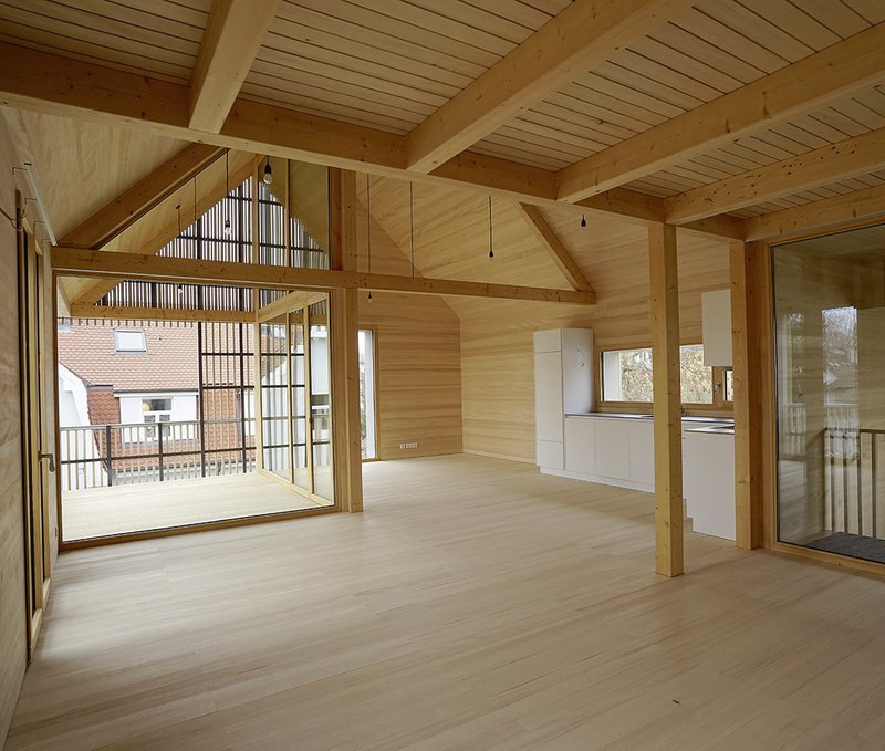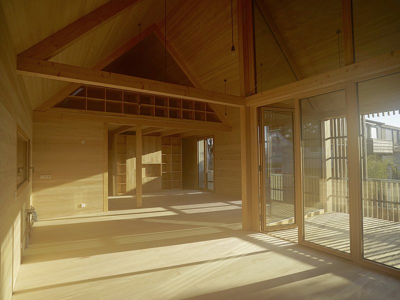 KonstruktionDie geringen Spannweiten des Hauses (max. 3 Meter) erlauben es, den gesamten Holz-Rahmenbau in Konstruktionsvollholz sowie den gesamten Ausbau in Massivholz zu erstellen. Die vorgefertigten Holzelemente wurden auf das in Stahlbeton erstellte Kellergeschoss gesetzt.