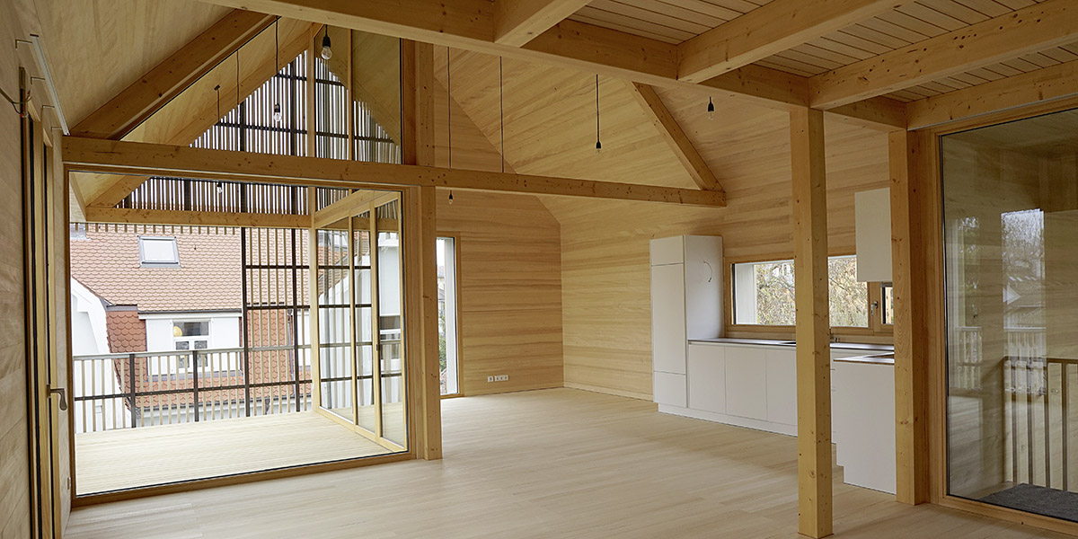 Brandschutz Um die brandschutztechnischen Anforderungen der Feuerwiderstandsklasse F30 für die Gebäudeklasse 3 zu erfüllen, wurden die sichtbaren Deckenbalken mit einem Querschnitt von 12 cm, die freistehenden Stützen mit 14 cm ausgeführt. Das Fluchttreppenhaus ist innen mit nicht brennbaren Gipskartonplatten verkleidet.