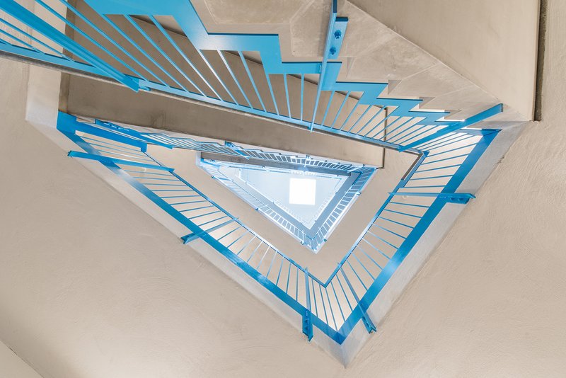 Der abgesenkte Vorplatz öffnet das Haus zu dem zentralen Gemeinschaftsraum und den seitlichen Eingängen. Der im Haus entstandene Höhensprung gibt dem Gemeinschaftsraum und dem Eingangsbereich eine großzügige Höhe von deutlich über 3m. Über breite Treppen (und den Aufzug) erreicht man die ein halbes Geschoss höher gelegenen polygonalen Treppenräume. Deren großzügige dreieckige Treppenaugen werden je von einem öffenbaren Oberlicht erhellt. In ihrer roten bzw. blauen Farbgestaltung unterscheiden sich die ansonsten identisch gestalteten Treppenhäuser und bieten den Bewohnern Identifikation und Orientierung. Der Gemeinschaftsraum verbindet beide Treppenhäuser und ermöglicht viele Alltagsbegegnungen.
