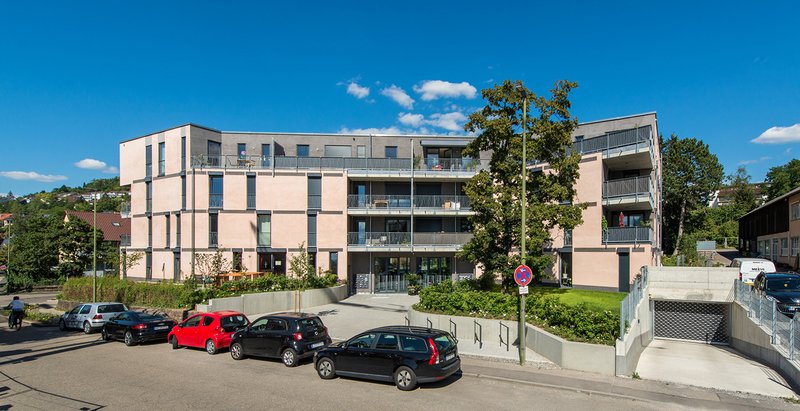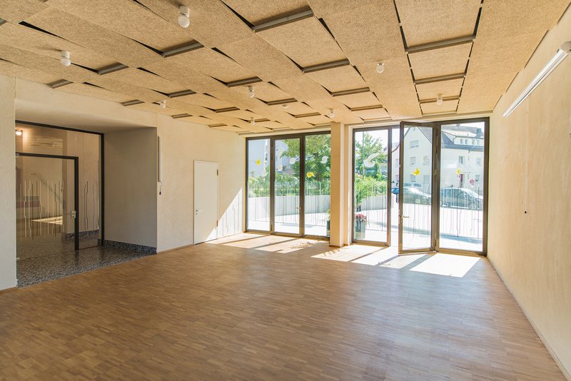 Die Grundrisse sind unterschiedlich nach den konkreten Bedürfnissen der Eigentümer und Bewohner gestaltet. Unter den Baukörper eingepasst liegt eine Tiefgarage und hält das Grundstück frei von Parkplätzen. Gemeinschaftsraum und Treppenhäuser sind mit einem sandfarbenen Putz geschlämmt, der Rohbau bleibt spürbar. Im Gemeinschaftsraum sorgen gegenläufig geschuppt angeordnete Heraklithplatten für die gewünschte Raumakustik, und das geölte Parkett schafft eine angenehme Atmosphäre. Über die großzügigen Verglasungen öffnet sich der Gemeinschaftsraum gleichzeitig zum Vorplatz und in den angrenzenden Garten.