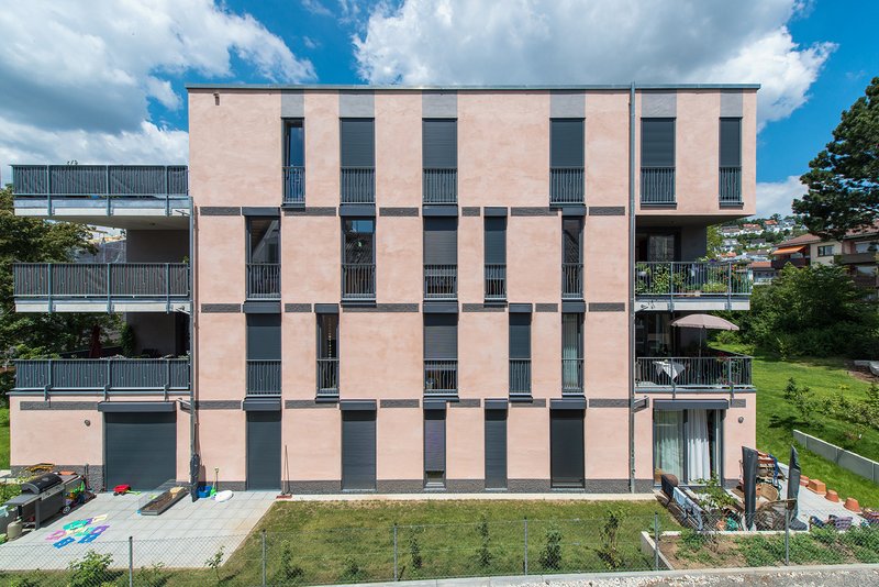 Der Baukörper, aus hochwärmedämmenden Ziegeln gemauert, ist mit einem mit Ziegelsplitt gefärbten Kalk verputzt. Die Fassade ist mit Streifen aus Kellenwurf in Höhe der Geschossdecken gegliedert. Diese dunklen Putzstreifen nehmen die grauen, vorstehenden Rollladenkästen auf und binden sie in die Gesamtgestaltung ein. Die dunkler gestalteten Rückwände der Loggien und Dachterrassen machen erlebbar, wie ihr Raum aus dem Gesamtvolumen herausgeschnitten ist.