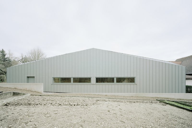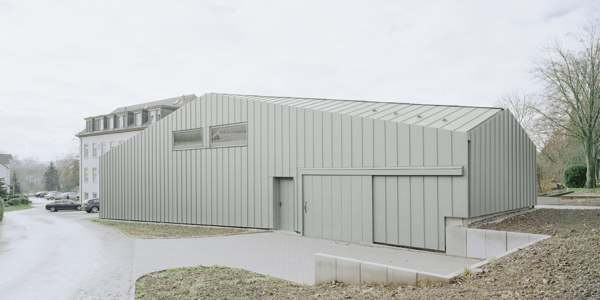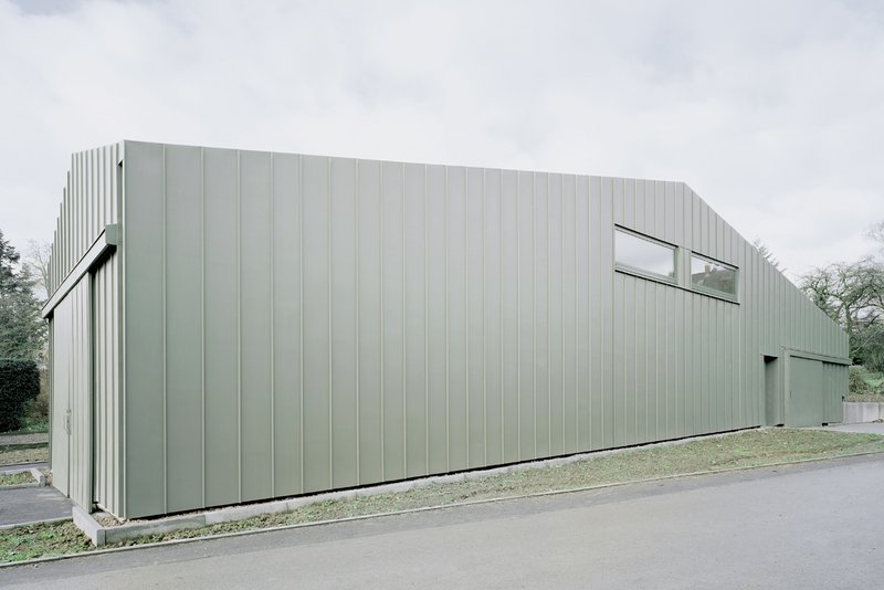 Die vier Fassaden zeigen die unterschiedlichen Nutzungen: Die kurze Südfassade beherbergt ein Schiebetor für die Garage der Nutzfahrzeuge. Die Nordfassade ist von einer niedrigen Betonwand umgeben und bildet den Lagerplatz für Grüngut. Die lange Ostfassade ist von einem stark befahrenden Wirtschaftsweg für landwirtschaftliche Fahrzeuge des benachbarten Bauernhofs flankiert und ermöglicht den Müllfahrzeugen die Zufahrt zum Müllraum. Das Bandfester des Obergeschosses belichtet die gesamte Lagerfläche der oberen Ebene.Unmittelbar entlang der Westfassade führt eine Rampe zum Müllraum, welche vom Personal genutzt wird – die Entsorgung erfolgt durch das Schiebetor auf der gegenüberliegenden Seite. Das lange Bandfenster gibt den Blick auf die Hausmeisterwerkstatt frei und erlaubt den freien Blick in den vorgelagerten Garten. Dort befindet sich der Nutzgarten der Stiftung. Das große, aber dennoch niedrige Gebäude stellt einen neutralen Hintergrund für die Gemüse- und Blumenbeete dar. Trotz der Hanglage wirkt das Gebäude durch die abgeknickten Dachflächen nicht zu groß. An den vier Gebäudeecken sind die Regenfallrohre in die Gebäudehülle integriert. Diese entwässern in eine 10.000 Liter fassende Zisterne, die den Nutzgarten bewässert. Sämtlichen Oberflächen der Gebäudehülle sind in gleichem Material aus vorpatiniertem Titanzink ausgeführt und geben somit dem Gebäudevolumen ein monolithisches Erscheinungsbild. Das vorpatinierte Titanzink wurde auch zur Verkleidung sämtlicher Türen, Tor und Details eingesetzt.