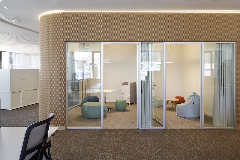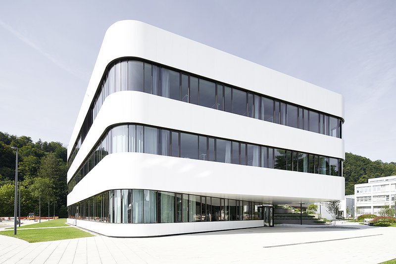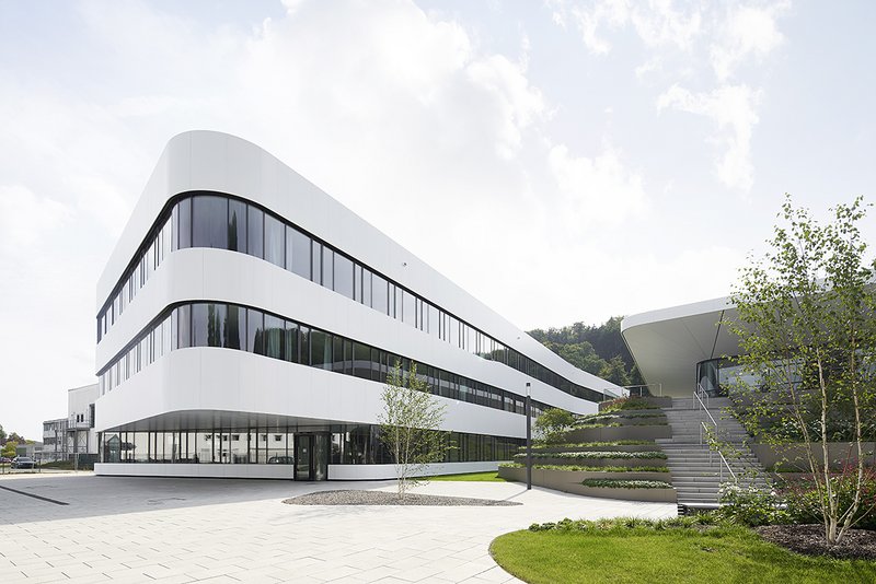 Menschlich, leidenschaftlich, professionell – die Markenwerte erlebbar darstellenDas Office-Gebäude erstreckt sich über drei Stockwerke und ist überwiegend durch Glas geprägt. So eröffnen sich den Mitarbeitern helle Räumlichkeiten mit einem freien Blick ins Grüne. Gemeinsam mit dem im gleichen Zeitraum entstandenem Forum dient das Gebäude als Identifikationspunkt und spiegelt die Unternehmens-DNA wider. Die weich fließende, organische Form betont das Menschliche und Fürsorgliche und symbolisiert damit die Leidenschaft, dem Menschen zu dienen. Die matt reflektierende, samtene und cleane Oberfläche der Fassade mutet eher kühl an und steht so in Spannung zur Fassadenformung – als Ausdruck der hohen Professionalität.