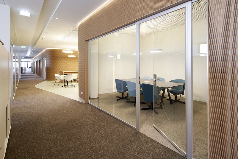 Das Außen nach innen holenIm Inneren der Bürowelt dominiert in allen Stockwerken ein mittlerer Funktionskern, welcher der organischen Form der Außenfassade nachempfunden ist. Damit wird die Dynamik der Fassadengestaltung in das Innere überführt. Der Funktionskern nimmt Meeting- und Fokusräume, Garderobe, Sanitärräume sowie Kaffeeküche auf. Die Arbeitsplätze sind entlang der Fensterfront angeordnet, die entstandene Mittelzone dient der temporären Nutzung. Büroflächen sind so angelegt, dass eine flexible Belegung mit Großraum-, Kojen- oder Einzelbürostrukturen möglich ist. Dafür wurde eine systemische Ausstattung und Vorhaltung der haustechnischen Anlagen entwickelt, die es ermöglicht in ca. jeder dritten Achse ein Einzelbüro auch nachträglich einzurichten. Die baulichen Voraussetzungen hierfür wie der Einbau der luft- und elektrotechnischen Anlagen sowie die erforderlichen baulichen Maßnahmen in Boden- und Deckenkonstruktionen sind bereits geschaffen. Trotz seiner dynamischen und unregelmäßigen Kubatur, sind nur sehr wenige Elemente nicht im Standard-Raster von 2,70 m, was eine ökonomische Bauweise zulässt.