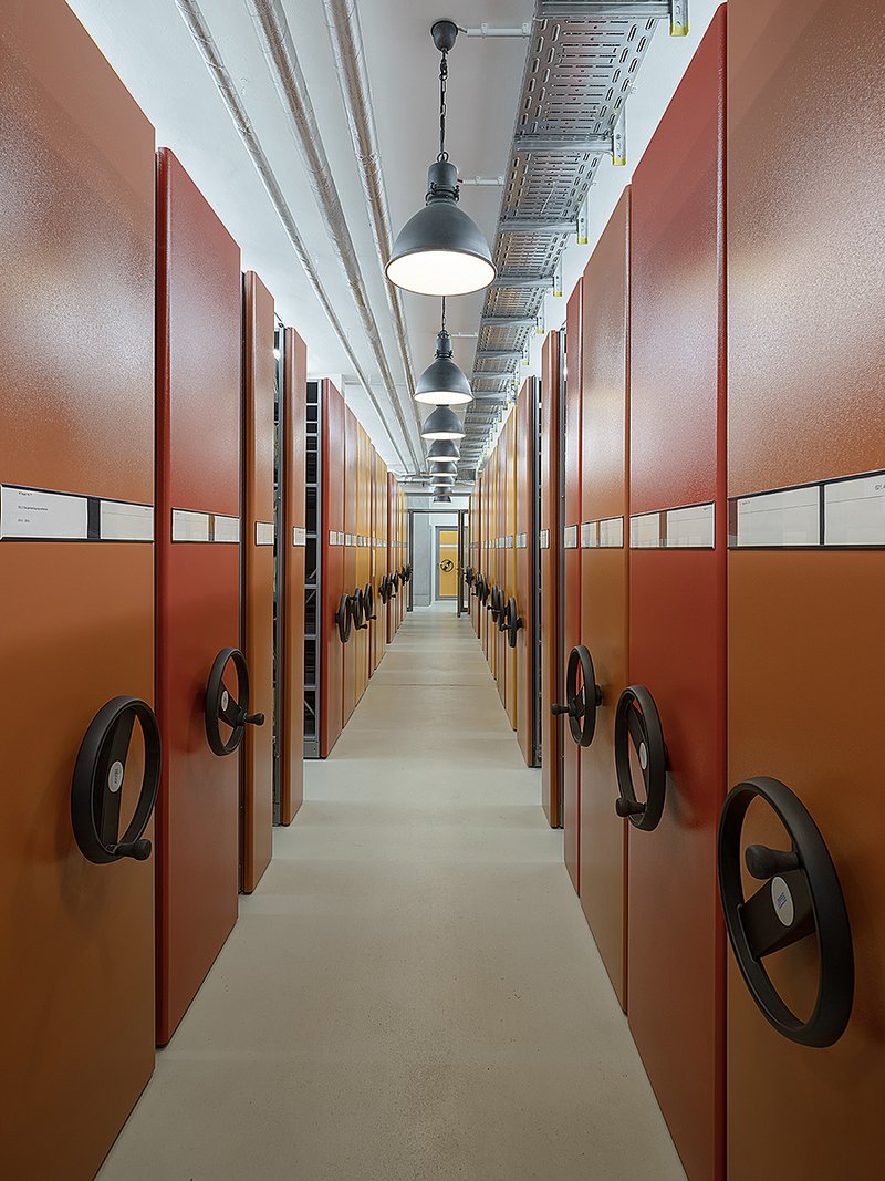 Im Erdgeschoss wurden auf der neuen Sohlplatte Rollregale montiert. Im Obergeschoss sind aus konstruktiven Gründen Pfostenregale auf der Holzbalkendecke mit geringen Lastreserven angeordnet. Im Kaltdach wurde das Rückkühlwerk des Neubaus untergebracht und im übrigen steht er als Ausbaureserve zur Verfügung.
