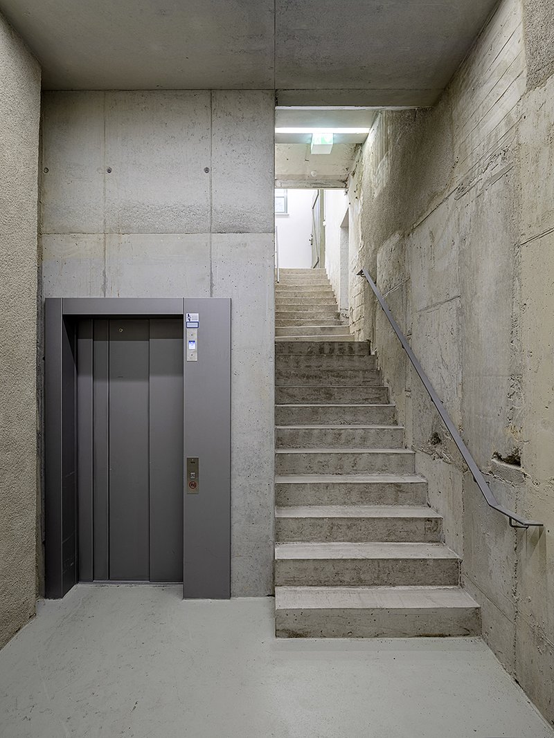 UmnutzungDie künftige Nutzung als Hauptarchiv mit 10.000 laufenden Regalmetern begrenzt den Sanierungsaufwand hinsichtlich Schall- und Wärmeschutz und ermöglicht den weitgehend problemlosen Erhalt der Sichtmauerwerksfassade. Zur vielbefahrenen Friedrichstraße dient das Gebäude als Schallbarriere für das dahinter neu errichtete Bürogebäude. Das Treppenhaus wurde bis in den Bereich der Teilunterkellerung verlängert und mit einem Tunnel an die Tiefgarage des Neubaus angebunden. Alle Gebäudeteile des Landratsamtes sind hierdurch wettergeschützt miteinander verbunden, die reibungslose Zusammenarbeit mit dem Archiv ist gewährleistet und die städtebauliche Struktur der Solitäre bleibt erhalten. Ein neuer Aufzug im Altbau verbindet alle Ebenen barrierefrei. Eine Aufzugsüberfahrt über Dach sollte wegen ästhetischer und konstruktiver Gründe vermieden werden und konnte durch präzise Planung in das Haus integriert werden.