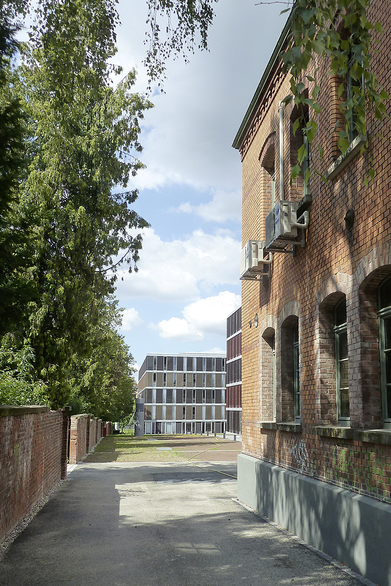 StädtebauDie Ergänzung der historischen Mauern begrenzt nach außen zusammen mit dem geretteten Altbau den Straßenraum der Allee sowie nach innen den geschlossenen Garten. Durch Nutzungsverschiebungen in den Altbau wurde die Größe der Neubauten reduziert, so dass diese unverändert als Solitäre frei im Gartenraum platziert werden konnten. Das ursprüngliche Wettbewerbskonzept wurde gewinnbringend für Stadt und Funktion weiterentwickelt.