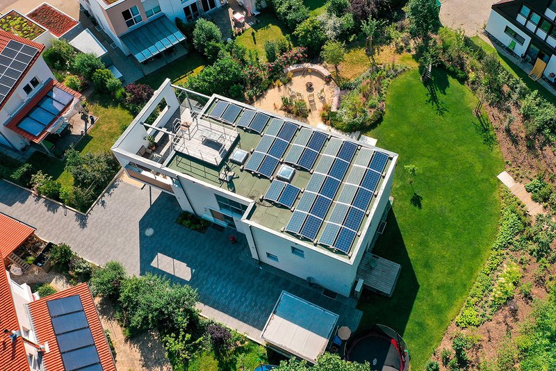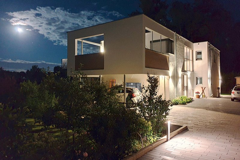 HaustechnikDas hohe energetische Niveau der Gebäudehülle – der Luftdichtigkeitswert von 0,4 1/h ist ein Drittel besser als im Passivhaus – ermöglicht ein sehr verbrauchsreduziertes Haustechnikkonzept. Zum Einsatz kommen eine hocheffiziente Luftwärmepumpe, Fußbodenheizung, Warmwasserbereitung mit Frischwasserstation, zentrale Lüftungsanlage mit Rotationswärmetauscher (Wärme- und Feuchterückgewinnung) und auf dem Dach eine PV-Anlage mit 10 kWp Leistung und einem Batteriespeicher mit 15 kWh Kapazität im Keller. Für Heizung, Warmwasser, Lüftung und Hilfsenergie (Pumpen, Steuerung) wurde ein Strombedarf von 3.600 kWh/a errechnet. In 2018 und 2019 wurden jeweils 10.000 kWh Strom verbraucht, einschließlich Haushaltsstrom und 2.000 kWh für das Elektroauto, das damit 13.000 km fuhr. Davon wurden 8.300 kWh durch die PV-Anlage erzeugt. Damit ist das Haus nach üblicher Betrachtung ein Plusenergiehaus, das mehr Energie erzeugt, als es (sogar inkl. Haushaltsstrom!) verbraucht. Der große Batteriespeicher ermöglicht eine Autarkiequote von ca. 50 Prozent und eine Eigenverbrauchsquote von 60 Prozent. Durch konsequente Außenbeschattung und die gute Wärmedämmung ist eine Klimatisierung nicht erforderlich. Es genügt bei Bedarf eine erhöhte Nachtlüftung über die Lüftungsanlage.
