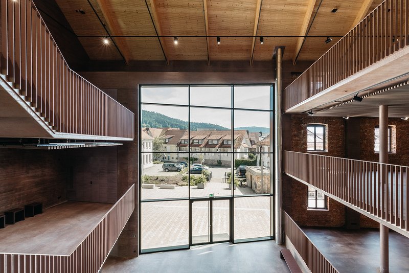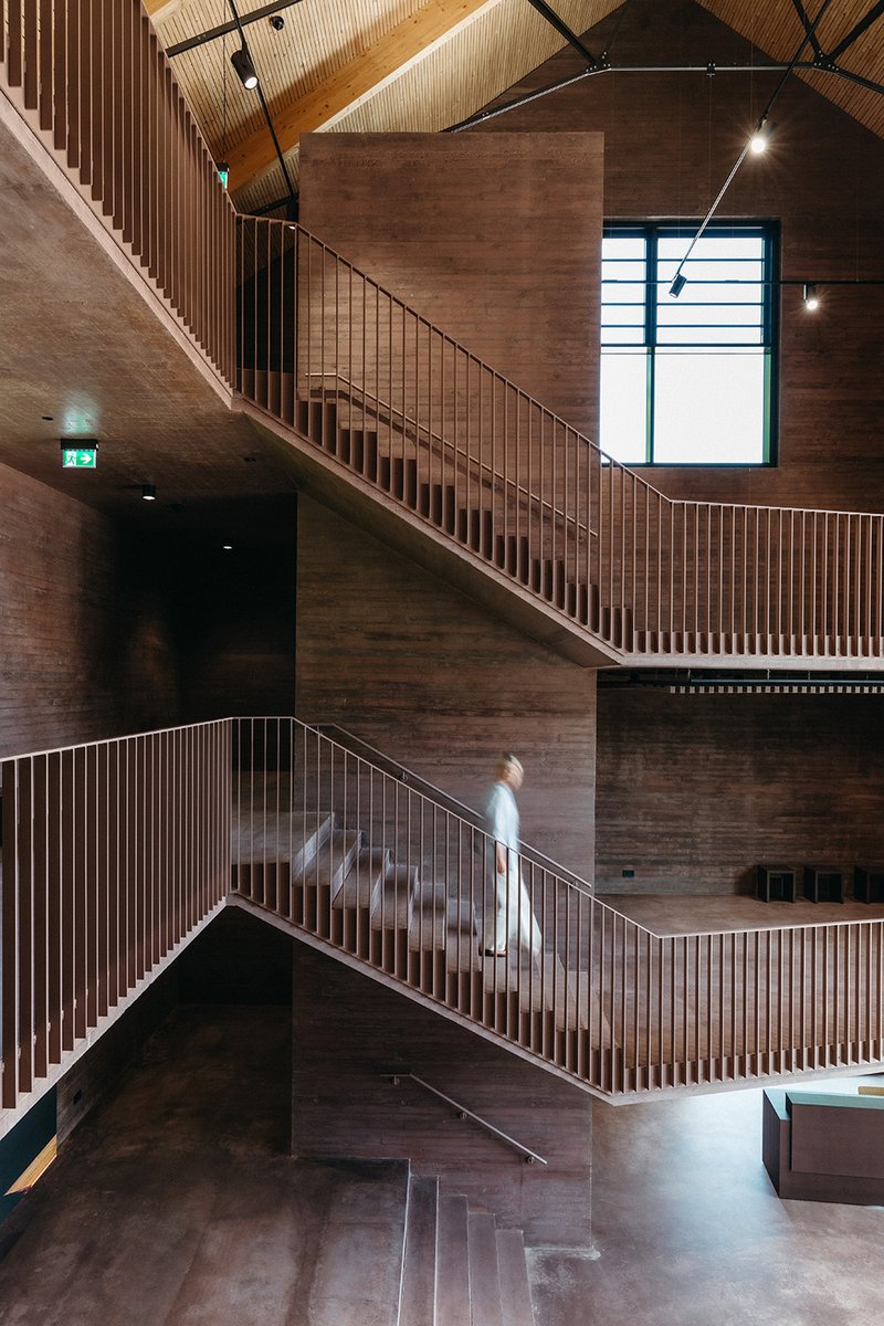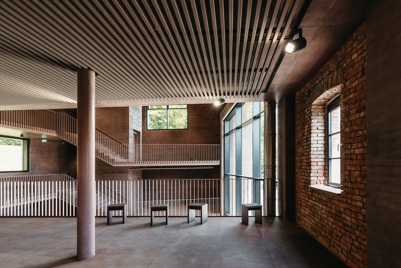 Struktur und Material Die Materialwahl in Bestand und Erweiterung vermitteln in Ihrer Härte atmosphärisch subtil die frühere industrielle Bedeutung des Ortes. Im Bestand wurden die vorhandenen, baufälligen Zwischendecken durch neue, tragfähige und nachhaltige Betondecken mit Bauteilaktivierung ersetzt. Hierbei wird der archaische Charakter der Industriearchitektur aufgenommen und weiterinterpretiert, um die Atmosphäre und Ausstrahlung des Rundofens nicht zu schmälern. Die Außenwände, welche sich nach oben hin geschossweise verjüngen, werden durch eine innenseitig vorgesetzte, farblich den Ziegelwänden angepasste Dämmbetonschale ertüchtigt und energetisch aufgewertet.