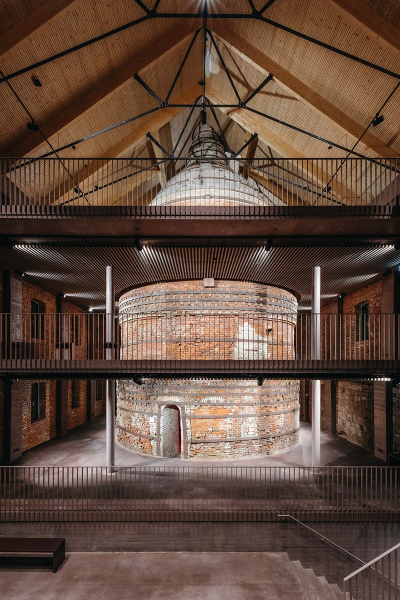 Eine breite, museale Differenztreppe erschließt vom Eingangsfoyer aus die erste Ebene des historischen Rundofengebäudes, wobei diese Ebene im Anbau weitergeführt wird. Auch aus dieser Perspektive lässt sich der Backsteinkorpus aufgrund der großzügigen Lufträume erfahren und aus einem neuen Blickwinkel erfassen. Dieses Konzept, den eigentlichen Rundofen als Hauptakteur in seiner schlichten und beeindruckenden Größe und Gestalt für sich wirken zu lassen und immer wieder neu zu inszenieren, setzt sich im weiteren Begehen des Museums fort.