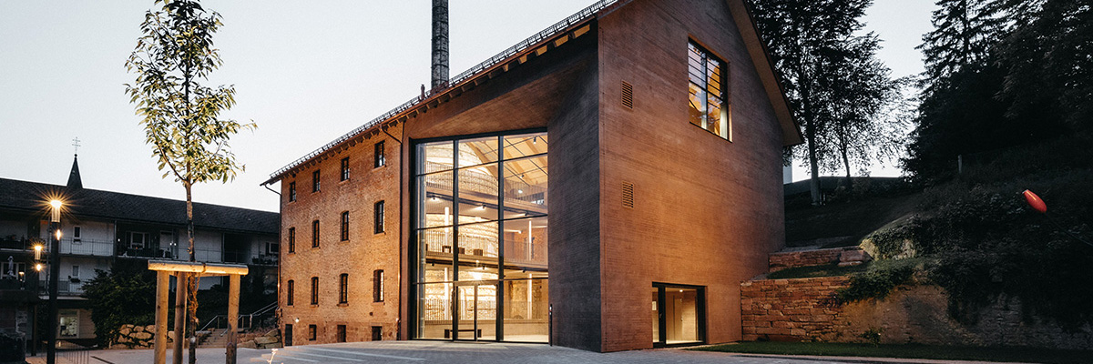 Die Außenfassade des Anbaus und die dachanhebenden neuen Wandteile, sind von außen auch als solche „neu“ ablesbar. Dennoch ordnet sich der Sichtbetonanbau durch die Einfärbung in eine backsteinfarbene Schattierung dem Bestandsbau unter und erzeugt eine neue Homogenität, ohne sich als „fremd“ abzugrenzen. Der Dämmsichtbeton, als homogenes schichtloses und somit industriearchaisches Material, behält seine Färbung auch im Innenraum bei. Durch eine entsprechende Beleuchtung wird eine dem Thema „Rundofen“ passende Atmosphäre geschaffen- weit entfernt von klinisch weißer und beliebiger Museumsarchitektur. Das Gebäude leuchtet nun auch in den Abendstunden, bei Dämmerung und Dunkelheit von innen heraus verheißungsvoll, einladend und warm.