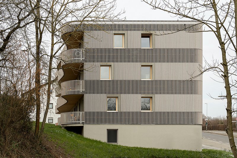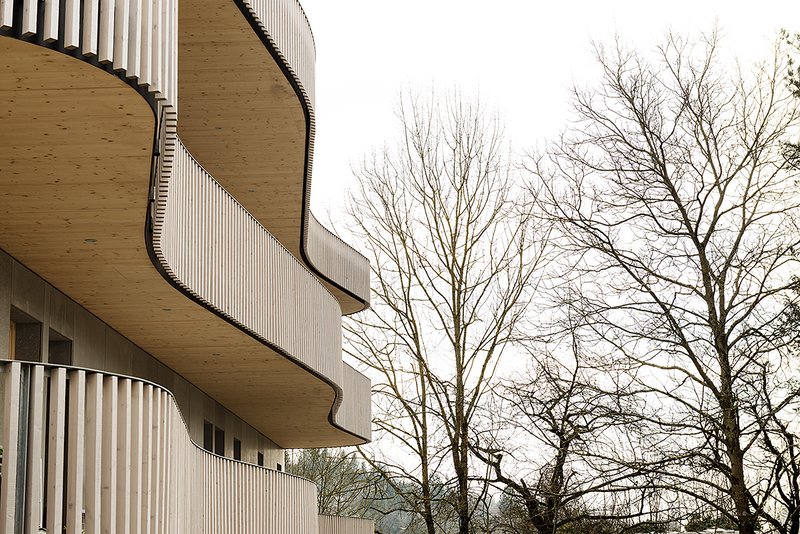Der Einsatz von BSP-Massivdecken ermöglicht eine kostengünstige Konstruktion der großzügigen Balkone als statische Kragarme. Durch die computergestütze Fertigung lässt sich deren geschwungene Kontur wirtschaftlich umsetzen. Trotz einer niedrigen Baukosten-Obergrenze konnten des weiteren Holzfenster, eine Luftwärmepumpe und Fußbodenheizung und hochwertig geflieste Bäder realisiert werden.