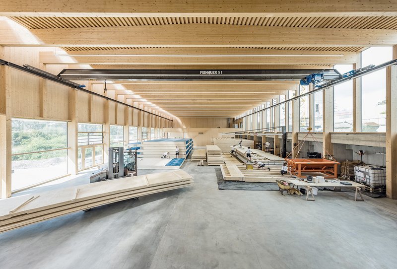 FertigungshalleDie Breite der Fertigungshalle von 25 Metern wird durch BSH-Träger im Achsabstand von 1,90 m überspannt, die auf BSH-Stützen aufliegen. In jeder zweiten Stützachse liegt die Kranbahn auf dem tiefen Stützenquerschnitt der Hauptstützen auf, die durch Einspannung in die betonierte Hangstützwand gleichzeitig die Queraussteifung der Halle übernehmen. Entlang der Südfassade sorgt ein wandartiger Träger aus Brettsperrholz dafür, dass große Fassadenöffnungen und Tore möglich sind. Die Fassade besteht aus Brettern mit Waldkante, die aus den Randabschnitten der Sekundärkonstruktion des Dachtragwerks bestehen. Damit kann der biogene Rohstoff Holz komplett stofflich genutzt. Alle Verbindungen sind mechanisch gefügt, so dass ein sortenreiner Rückbau und eine Wiederverwendung der Bauteile einfach möglich sind. Die Nordfassade der Halle ist mit gesägten Brettern verschalt, um das Gegenüber der beiden Gebäude zu reflektieren und um der Kleinteiligkeit der Fassadenflächen gerecht zu werden.