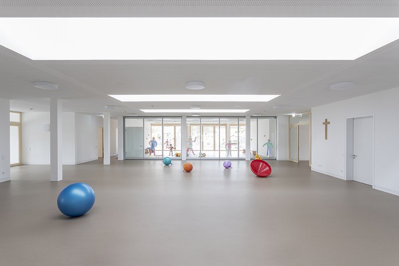 Das eingeschossige Gebäude ermöglicht eine schwellenlose Bewegung für alle Nutzer. Das Gebäude ist als Stadt konzipiert. Der Hauptbaukörper mit dem Eingang nimmt das zentrale Foyer und die allgemeinen, öffentlichen Räume auf. Die vier neuen Baukörper funktionieren als eigenständige Cluster, in denen je eine Gruppe des KBZO und der Kirchengemeinde untergebracht sind. Die Gruppenräume können durch große Verbindungstüren miteinander zusammengeschaltet werden. Eine innenliegende Straße verbindet die Baukörper, weitet sich zu Plätzen und gibt Ausblicke in die Natur frei.