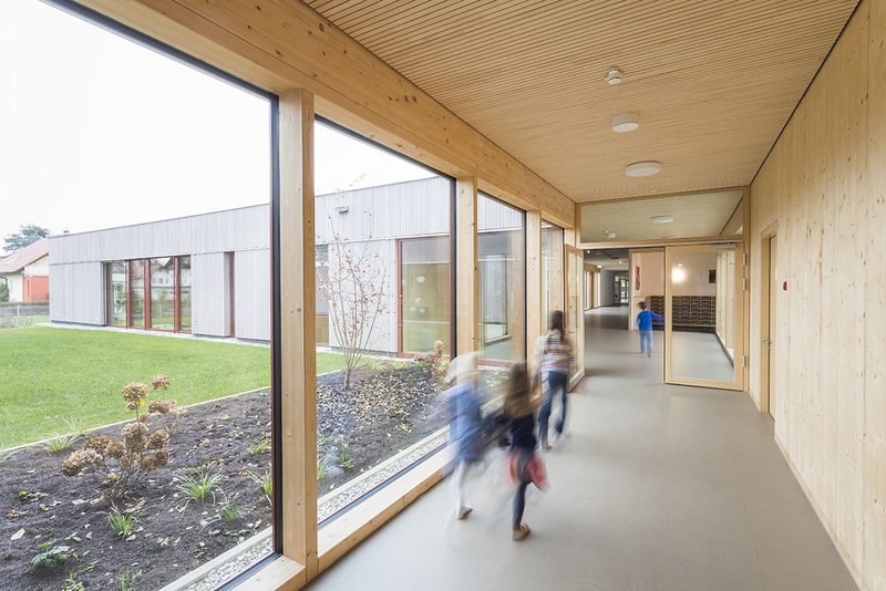 Das Bestandsgebäude in Massivbauweise wurde in das neue Volumen integriert und verschmilzt mittels einer durchlaufenden Fassade mit den neuen Bauteilen zu einer Gesamtfigur. Die neuen Gebäudeteile wurden als Holzkonstruktion errichtet, bei der verleimte Holzelemente das tragende Gerüst als raumbildende Wand- und Dachscheiben bilden. Im Inneren des Bestandsgebäudes bleibt das Stahlbetonskelett durch eine weiße mineralische Oberflächengestaltung sichtbar und der Holzbau wird im Neubau mit seinen sichtbaren tragenden Elementen erlebbar.
