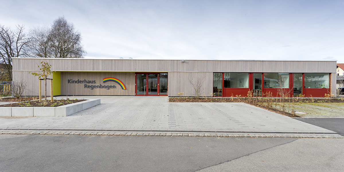 Die bauliche Erweiterung des Kindergartens erfolgte durch vier Baukörper Richtung Westen, die mit einer Haupterschließung verbunden wurden. Das Bestandsgebäude erhielt einen Anbau nach Norden und wurde zum Hauptbaukörper mit Eingang. Durch die versetzte Anordnung der ergänzenden Baukörper integriert sich der Gebäudekomplex in die kleinteilige Bebauungsstruktur. An der südöstlichen Ecke der Bebauung entstand eine klare rechteckige Freifläche, die die parkähnlich gestalteten Außenanlagen des Kindergartens aufnimmt.