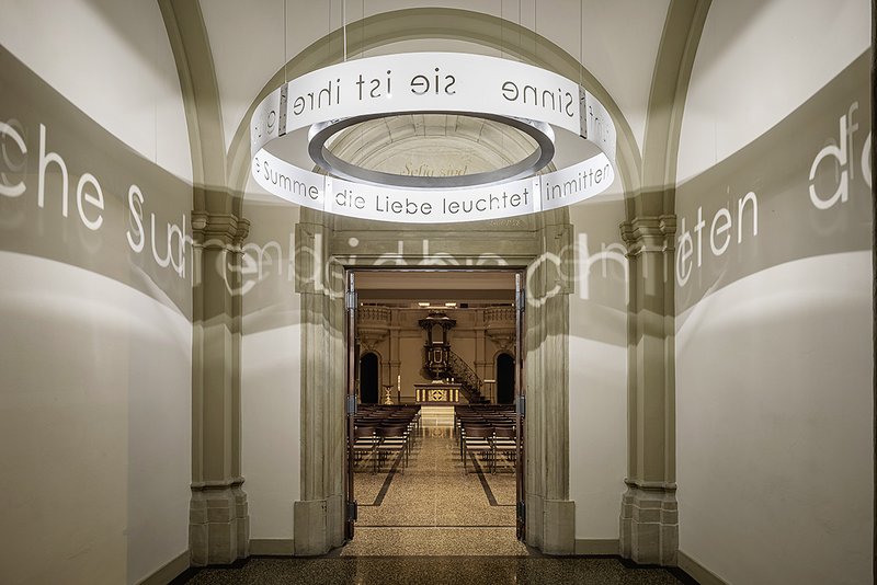 Der Pforzheimer Künstler Harald Kröner hat anknüpfend an den vorhandenen biblischen Text mit seinem Werk des Ringes im Eingangsraum, quasi in die Luft ein - geschrieben: "Die Liebe leuchtet inmitten der 5 Sinne, sie ist ihre glückliche Summe!"