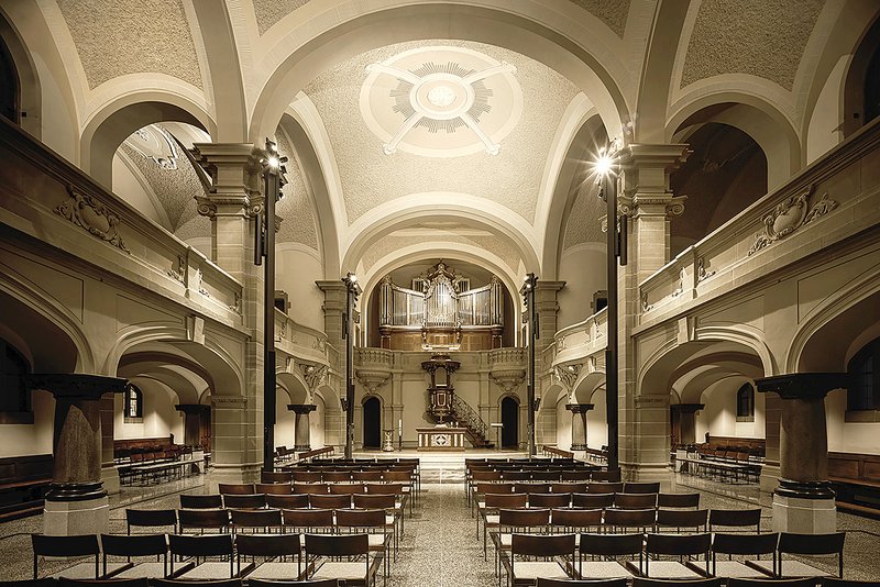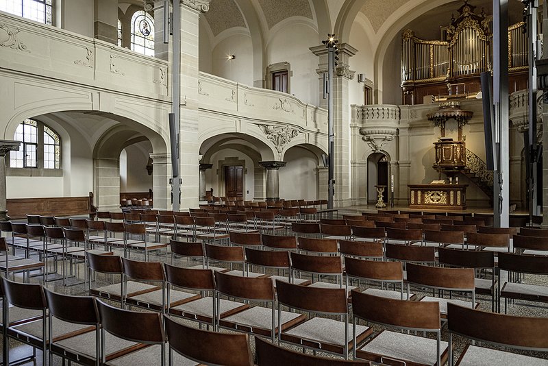Das Zusammenspiel von historischer Materialität und neobarocker Beschwingtheit (die Raumschale des Kirchenraumes wurde gemäß Befunduntersuchung in ihrer Originalfarbigkeit wieder hergestellt), variabler individuell gestalteter Bestuhlung und den neuen technischen Möglichkeiten (Beleuchtung, Ton, Hubpodestbühne) lädt die Kirchenbesucher ein, selbst tätig zu werden, zu bewegen, zu inspirieren! Eine zeitgenössische Fortschreibung des Wiesbadener Programms, dessen historische Achse sich zur Bewegungskoordinate wandelt.Besonderes Potential bildet die Möglichkeit, mit Bühnengazegeweben den zentralen Kirchenraum von den Seitenschiffen und bei Bedarf auch von der Orgelempore abzutrennen und einen introvertierten "Raum im Raum" als einhüllenden neuen Raum für Andachten, Gottesdienste und Projektionen zu nutzen.Die historische Orgel wurde umfassend saniert und erneuert und mit einem neuen Spieltisch passend in die Gesamtgestaltung eingebunden. Selbiges gilt für die Prinzipalien, die auf ihren Originalzustand zurückgeführt wurden. Ergänzend wurde die Sakristei im ehemaligen Konfirmandensaal zu einem multifunktionalen Arbeitsraum weiterentwickelt, der das vielschichtige Raumangebot ergänzt.