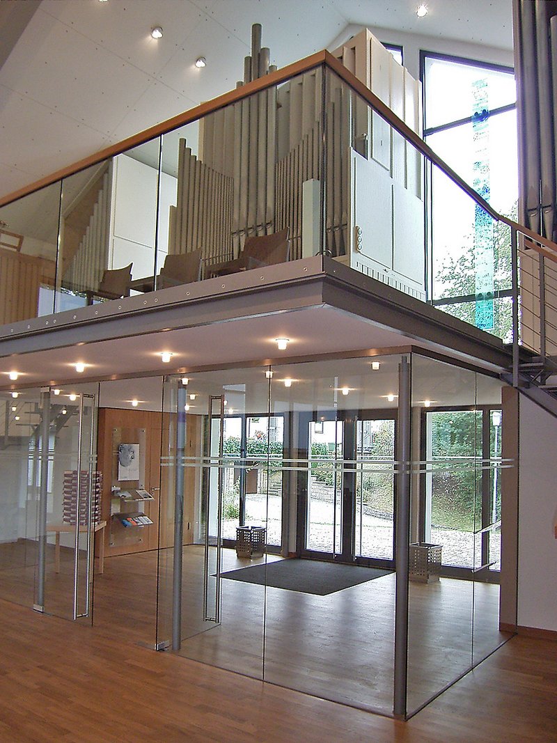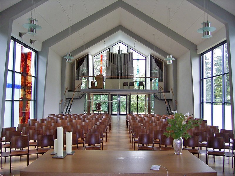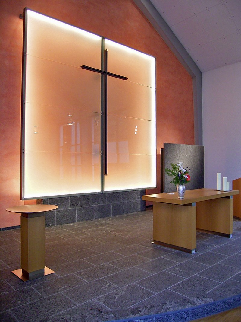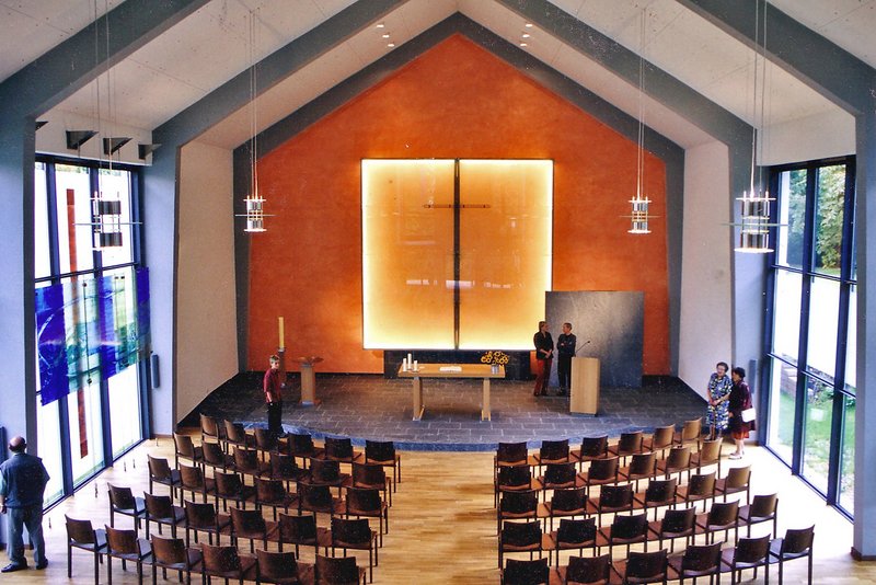 Baujahr: 2002, vorhandenes Kirchenschiff 1956Nutzfläche: 324 m²Glasfenster: Urs Gerber, Zufikon, Schweiz