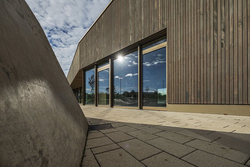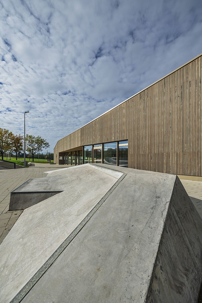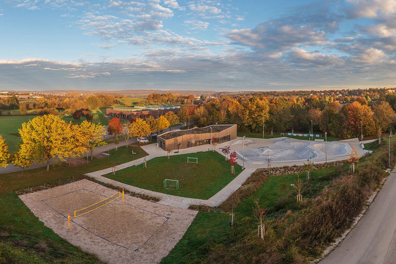 Die Außenanlagen enthalten neben befestigten Flächen unter anderem eine großzügig angelegte Skateanlage, ein Beachvolleyballfeld sowie Rasenspielflächen. Ziel war ein zeitgemäßes Angebot für Jugendliche mit vielfältigen Sport- und Freiflächen. Fließende Übergänge und klar definierte Funktionsbereiche schaffen großzügige Räume mit Ruhezonen und Zuschauerbereichen. Die Skateelemente sind eng mit der Architektur verbunden und flexibel nutzbar. Baum- und Gräserpflanzungen verleihen der Anlage einen heimischen Charakter und strukturieren den Außenraum.